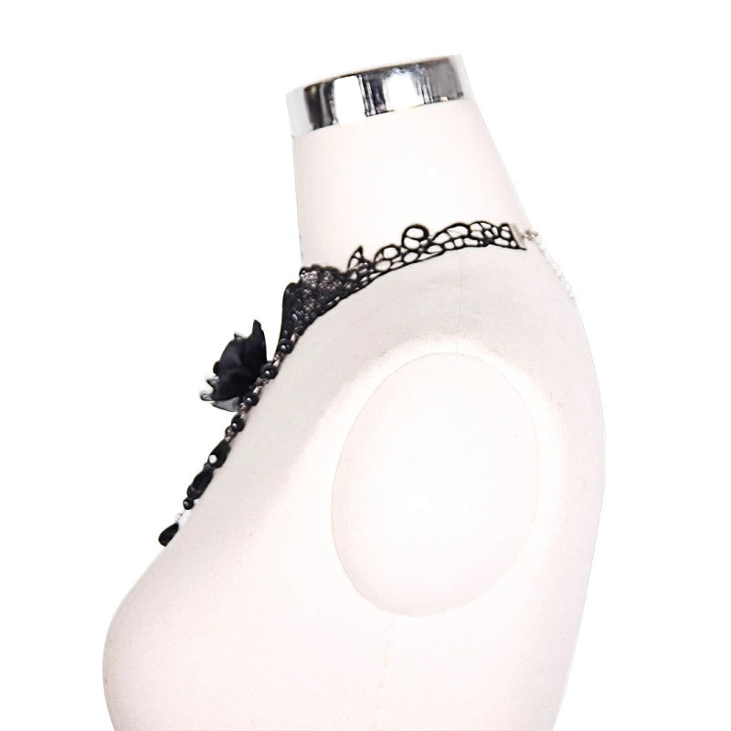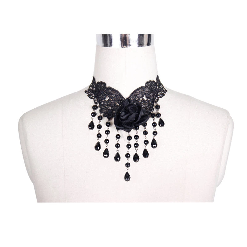 Gorgeous black lace choker style lace necklace from Devil Fashion with black rose and beading details. This elegant and darkly romantic neck gear also features delicate beading and delicate metal clasp. This amazing black necklace is the perfect way to bring a touch of gothic Victorianesque drama to any outfit!