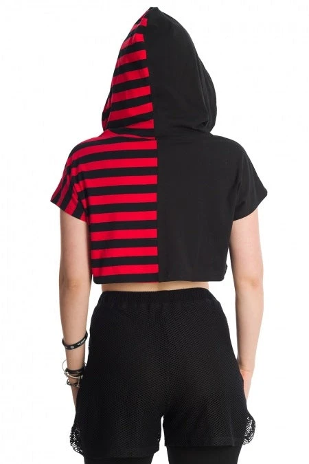 Awesome cropped black and red hoodie from Banned Apparel made from a soft cotton fabric. This must-have cropped hoodie is black on one side and red and black contrast stripes on the other. Perfect for layering with short sleeves and an oversize hood!