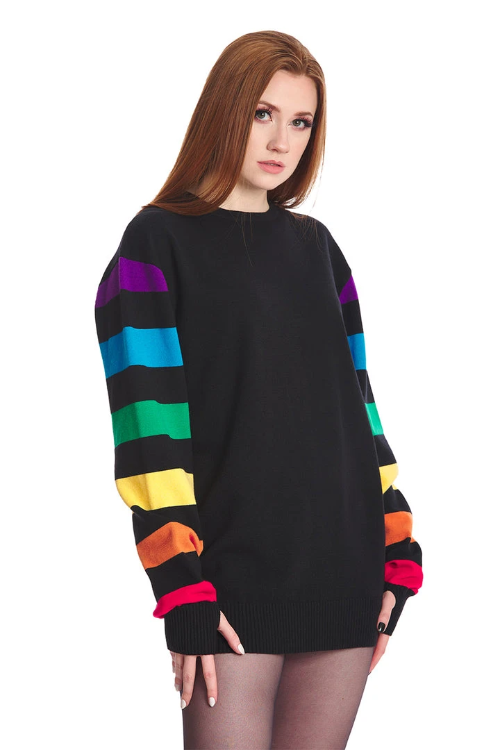 Gorgeous black knit dress from Banned Apparel featuring long rainbow stripe sleeves with thumb holes to the cuffs and ribbed hemline.