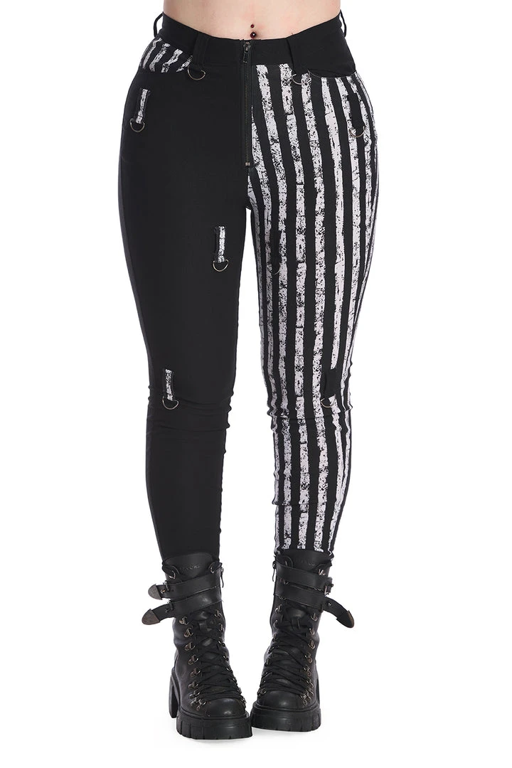 Awesome trousers from Banned Apparel featuring a half black and half black and white stripe design. With contrasting pockets, D-ring detailing and fastening with an exposed zip to the front.