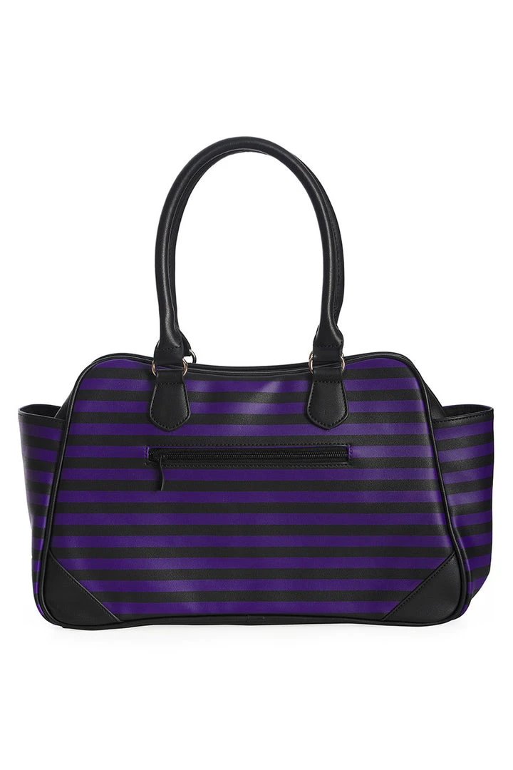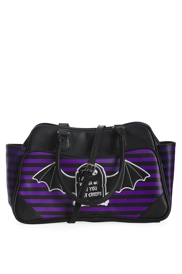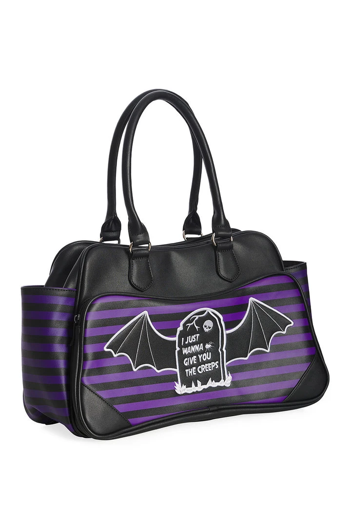 This fabulous faux leather handbag from Banned comes in a black and purple stripe with a bat winged tomb stone and the text ‘I Just Want To Give You The Creeps’. With front and side pockets, this stunning handbag fastens with a zip and features dual shoulder straps.