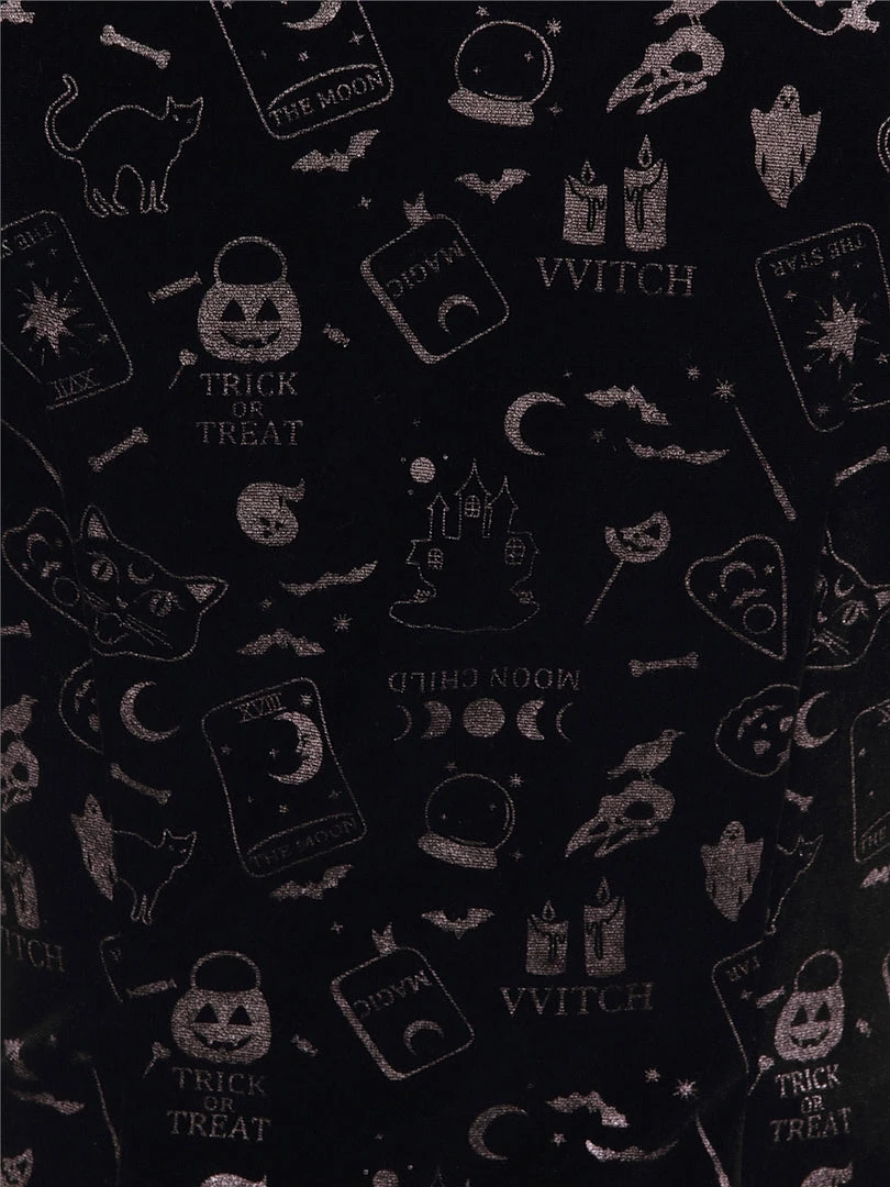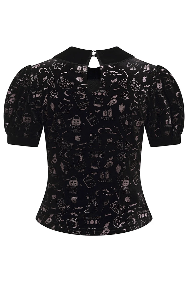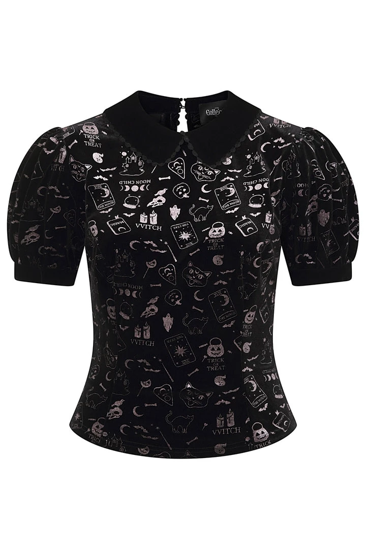 This fabulous black top from Collectif features a quirky spooky foil print featuring pumpkins, cats and moons etc. Fastening with back button with keyhole to the back and with Peter pan collar and short puff sleeves, it’s perfect for those warmer months. Full length in a UK 10 is approximately 53.5cm/21″.