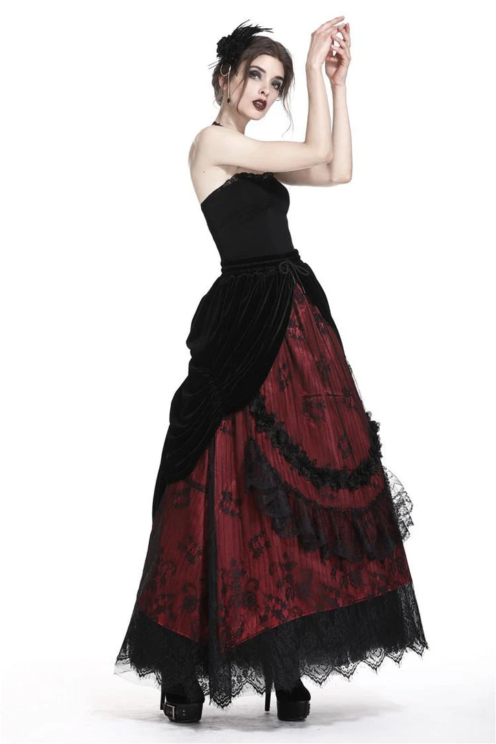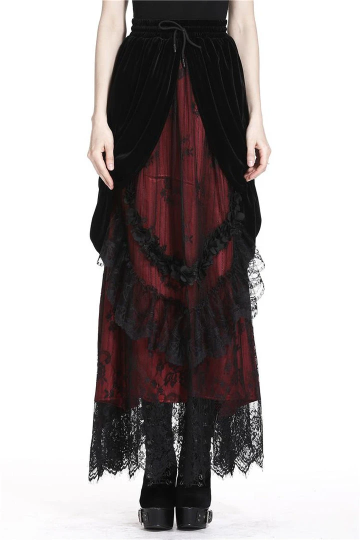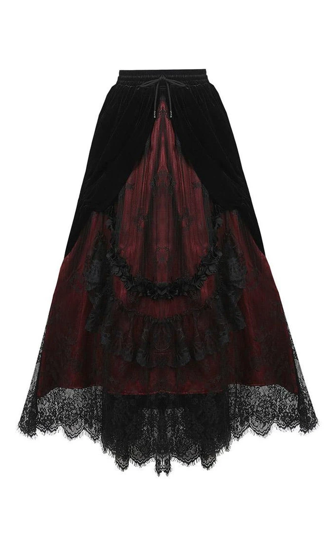 Breathtaking trad goth inspired maxi skirt from Dark In Love! The gorgeous Arabella skirt is made from layers of sumptuous black velvet and lace with a vampy red underskirt. Make this full-length skirt all the more dramatic by wearing with a petticoat for added volume. An elasticated waistband makes this full-length skirt super comfy to wear all throughout the day.
