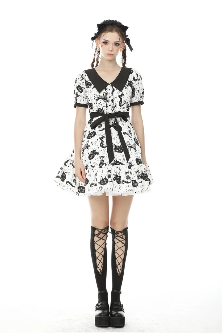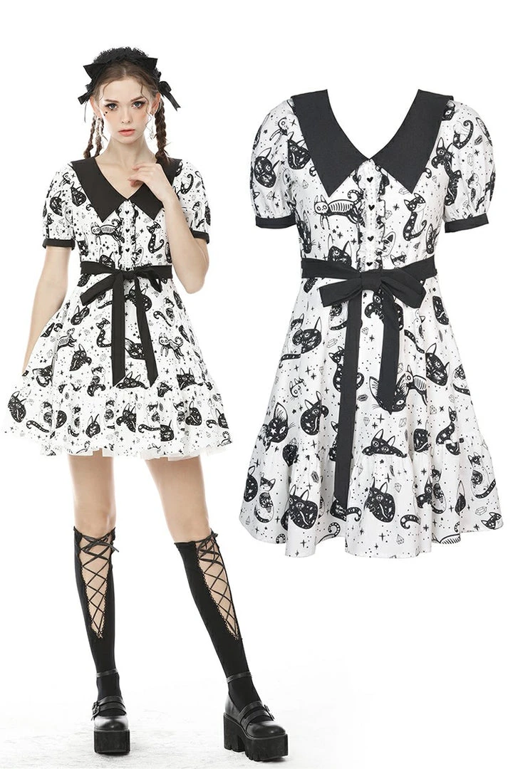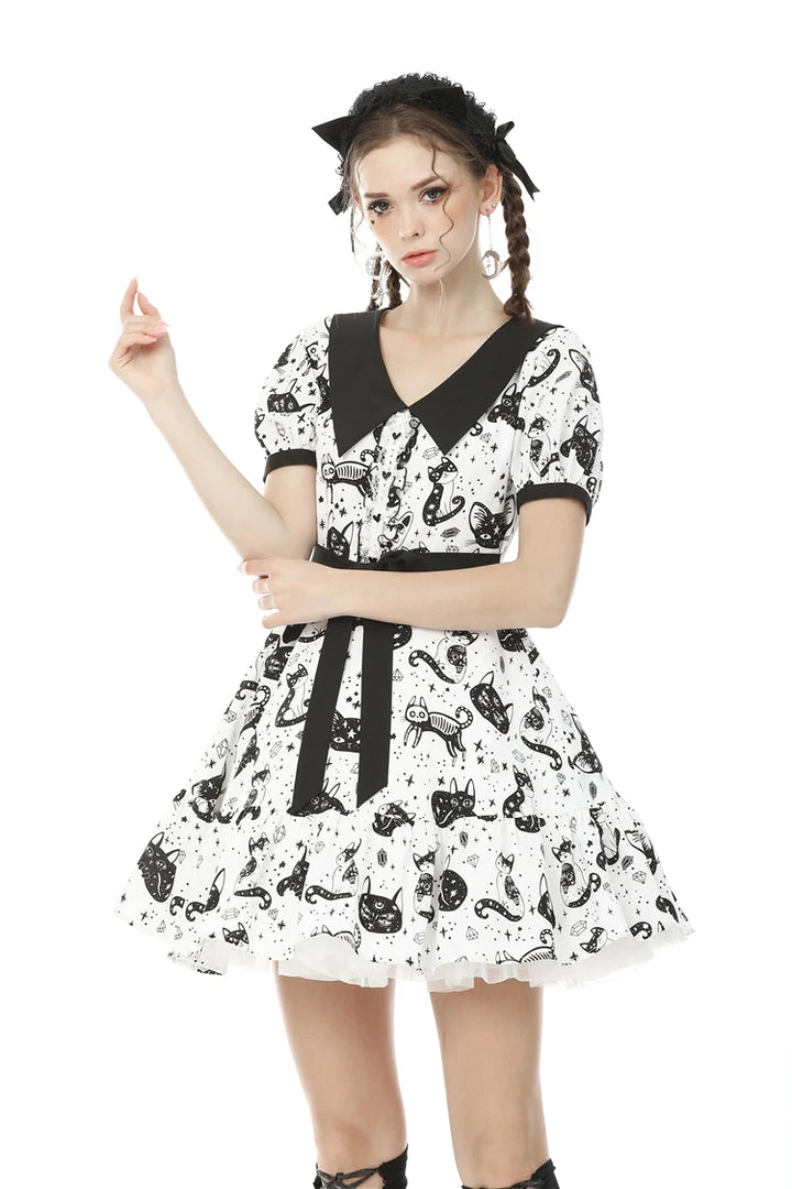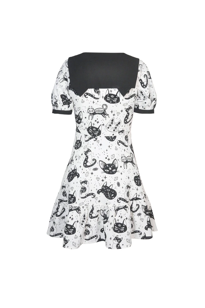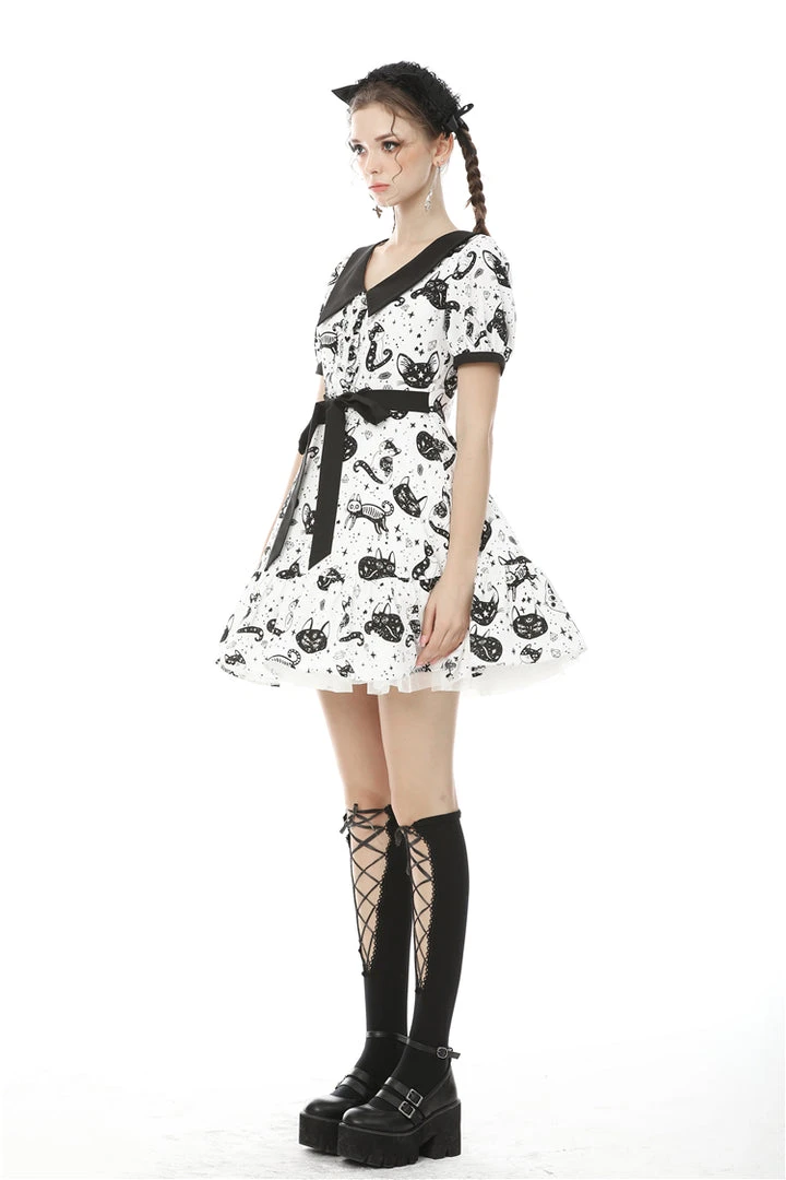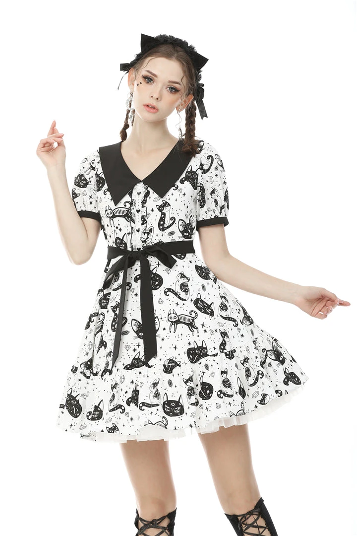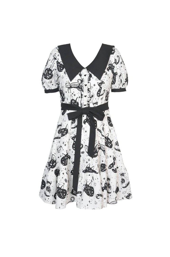 Cosmic mini dress from Dark In Love! This stunning dress comes in a striking kitty print and features a contrasting black collar and black fabric belt. Fastening with a concealed side zip, for the perfect fit please see Dark in Loves size guide in the images.