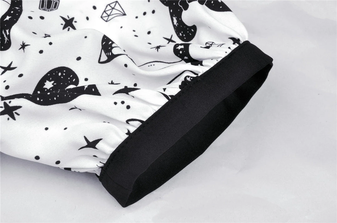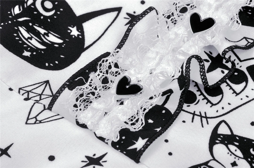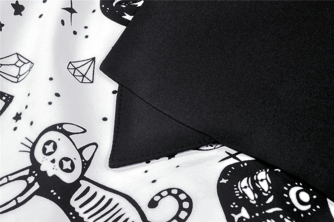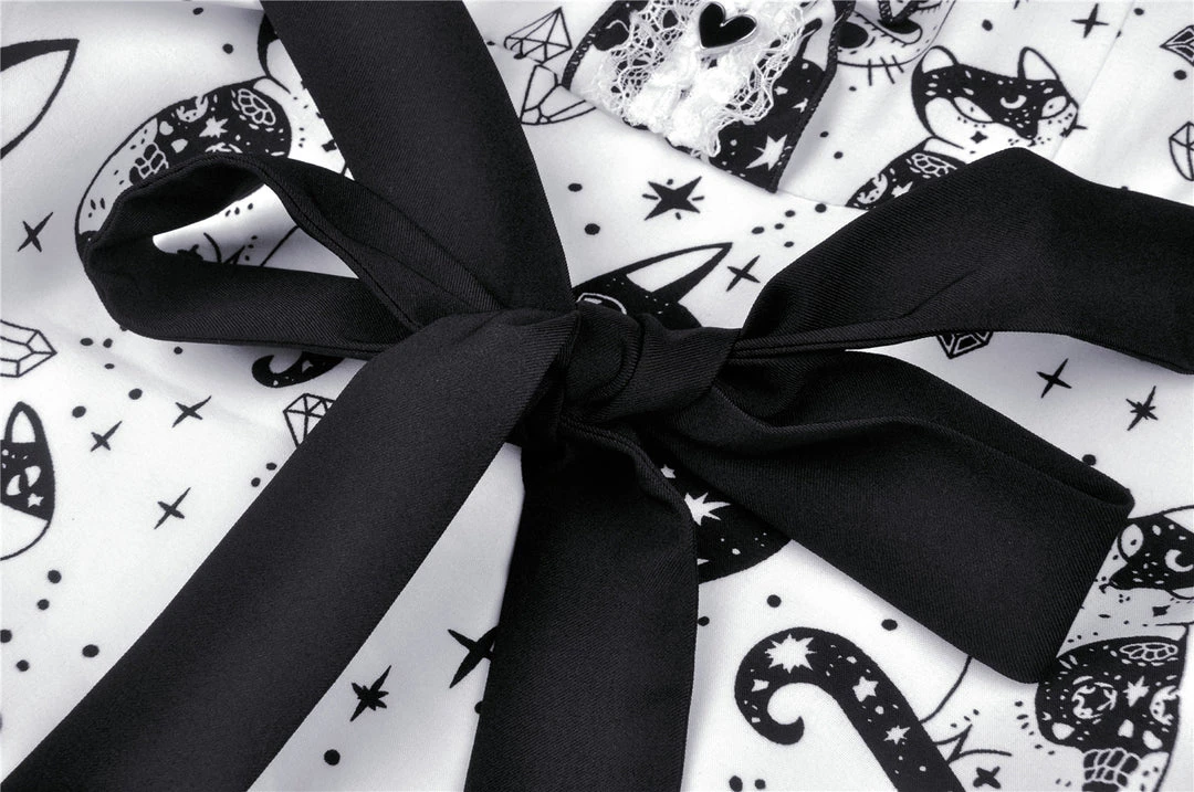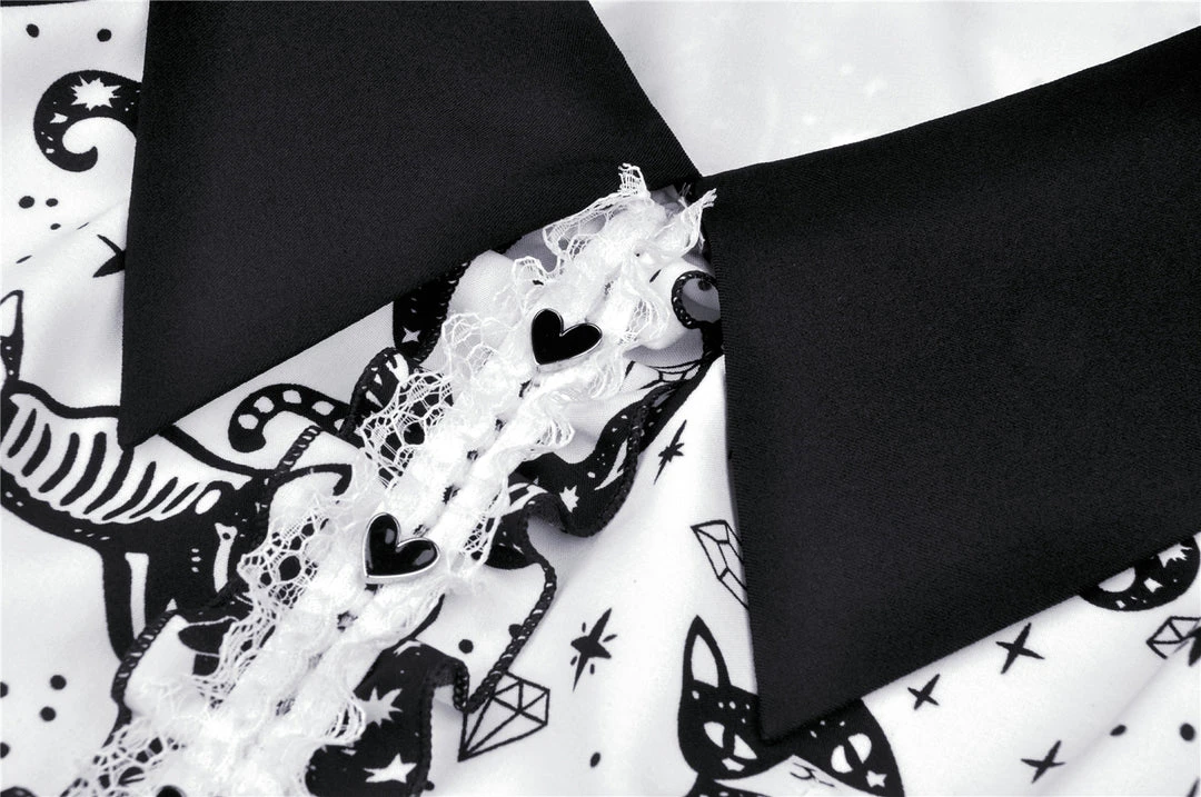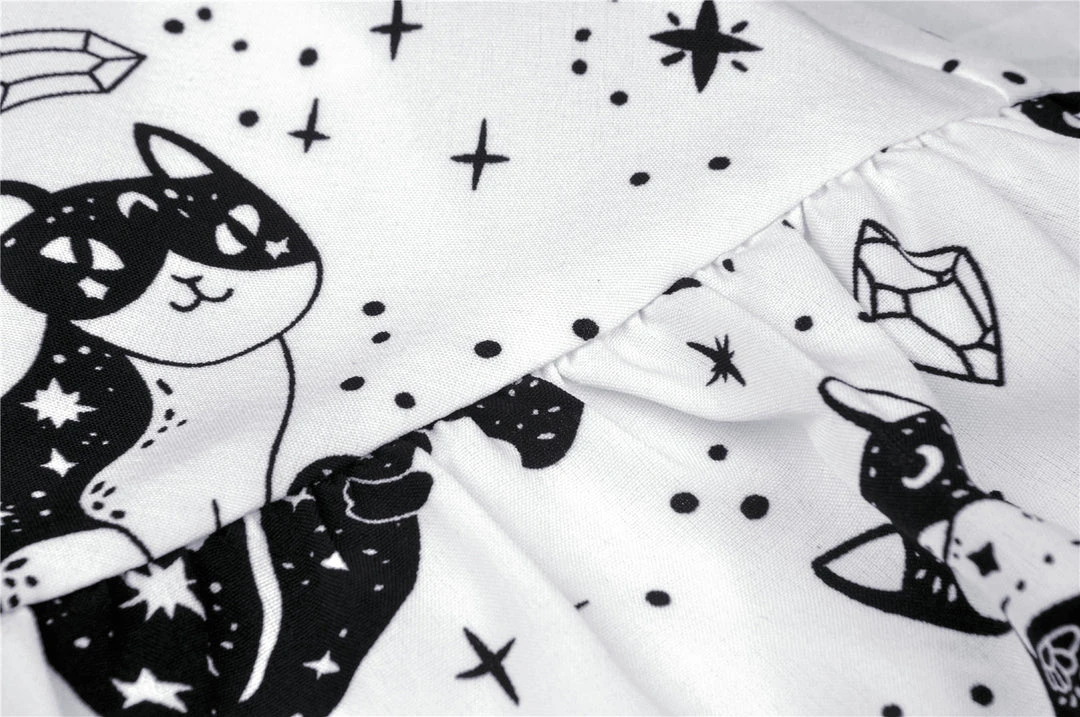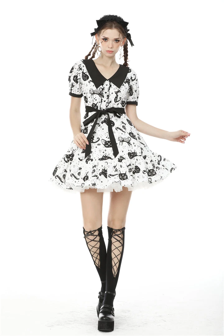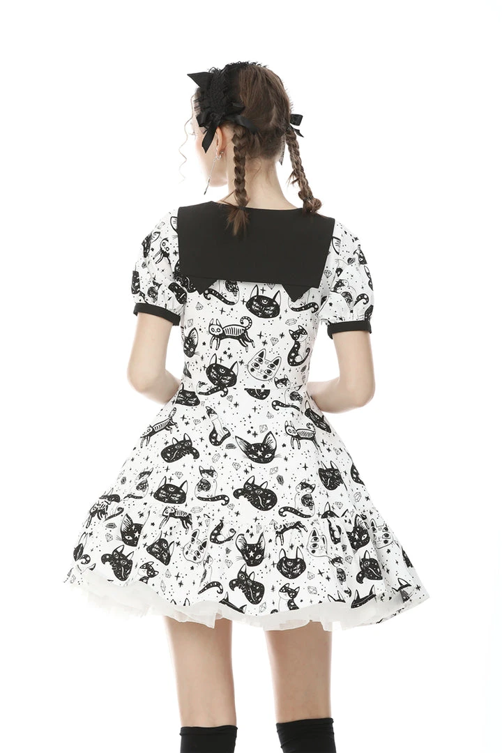 Cosmic mini dress from Dark In Love! This stunning dress comes in a striking kitty print and features a contrasting black collar and black fabric belt. Fastening with a concealed side zip, for the perfect fit please see Dark in Loves size guide in the images.