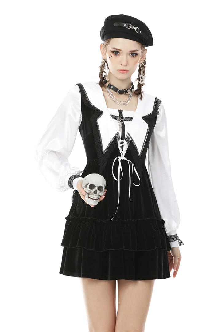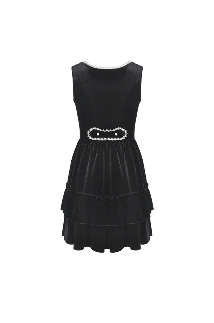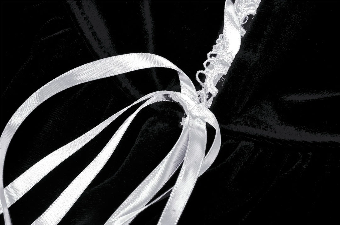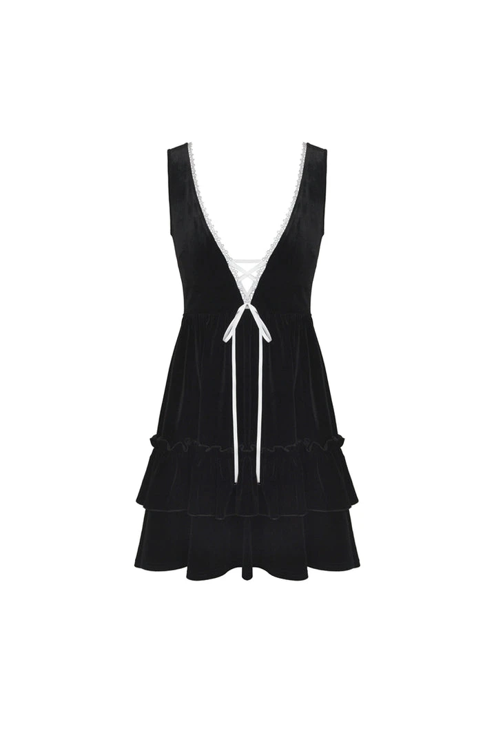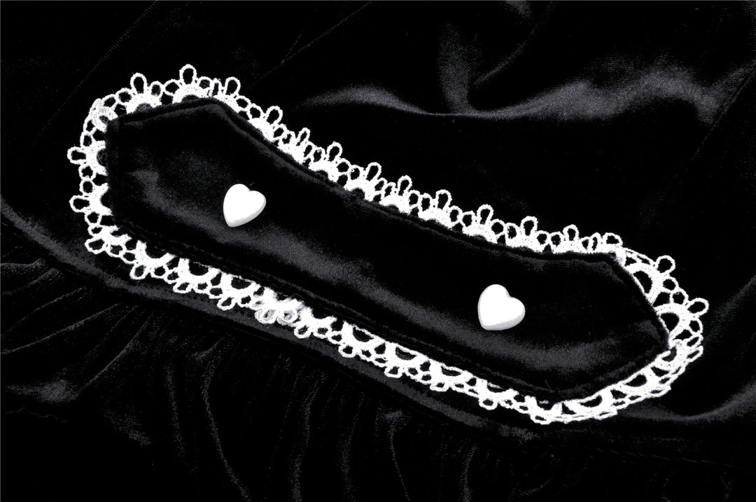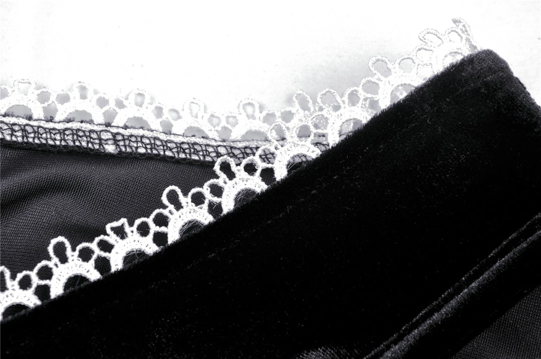This stunning velvet dress from Dark in Love features contrasting white lace trim to the deep V-neck with white ribbon lacing. Made from a soft stretchy velvet, the skirt has a tiered design with ruffle detail and decorative waist detail to the back with white heart buttons. For the perfect fit please see Dark in Loves size guide in the images.