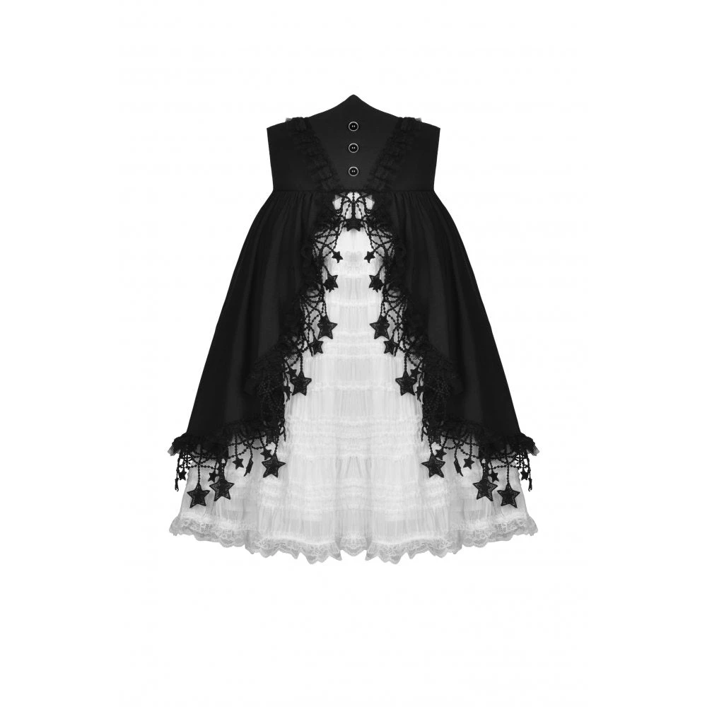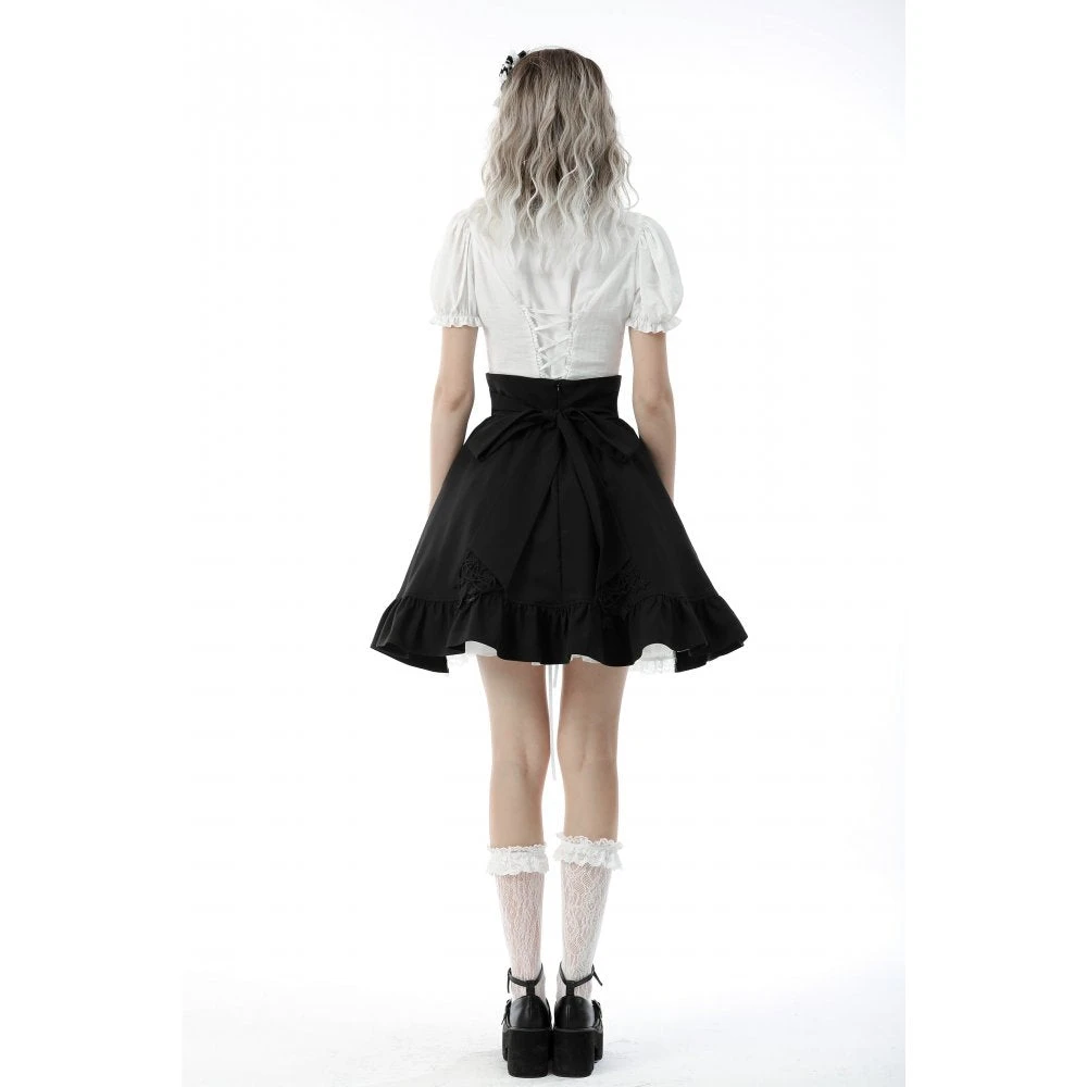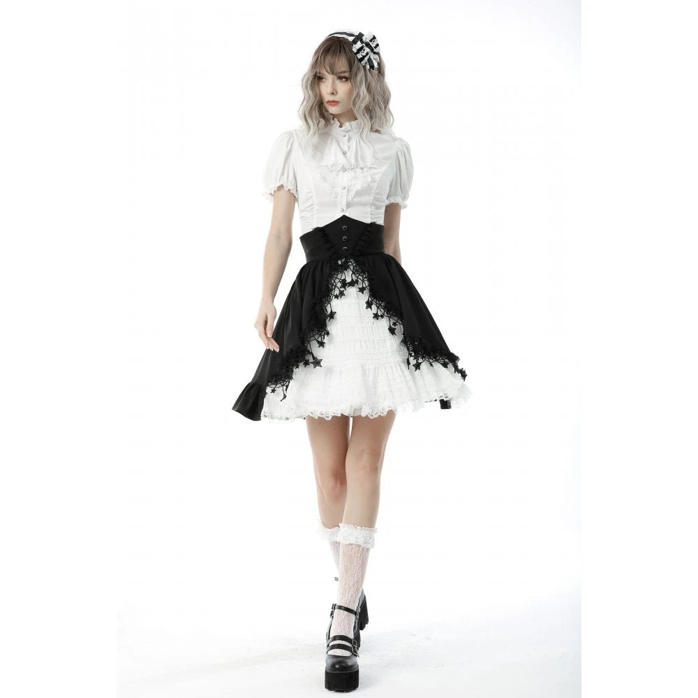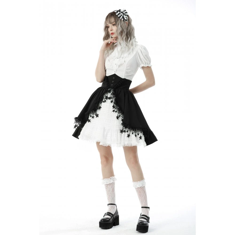 You’ll love this stunning high waisted black and white skirt from Dark in Love with white under layer and black waistband and over layer! This lovely skirt features hanging stars, and a layered skirt that will flatter your figure to perfection. This amazing dress has a black ribbon bow tie and comes with a spare button.