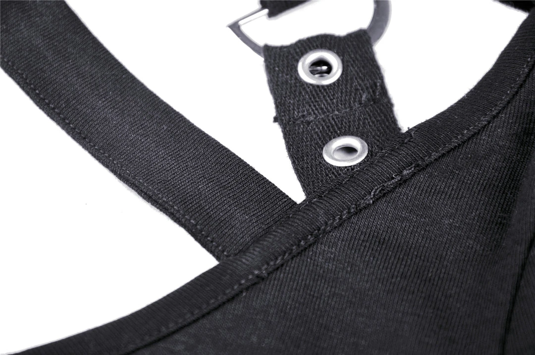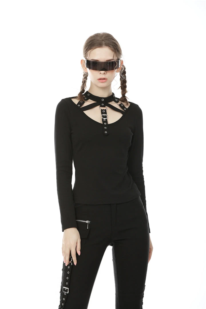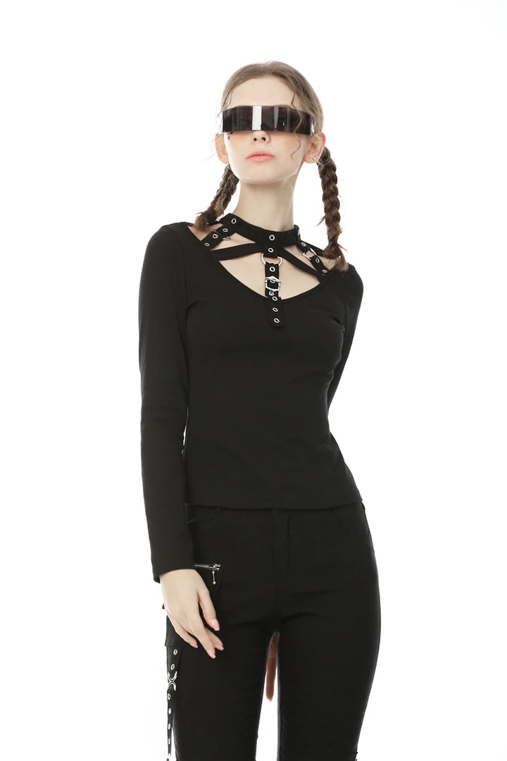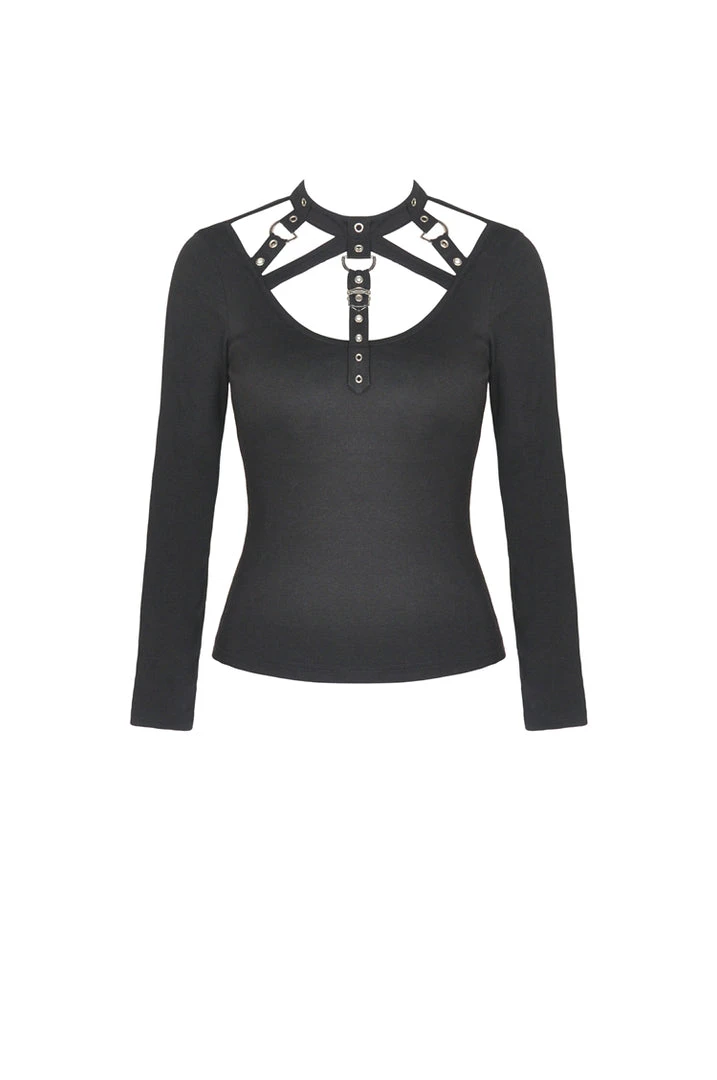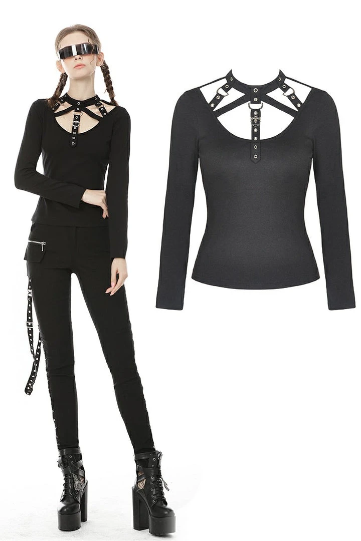Lovely soft cotton mix top from Dark in Love featuring long sleeves and multiple strap detailing to the decollotage. For the perfect fit please see Dark in Loves size guide in the images.