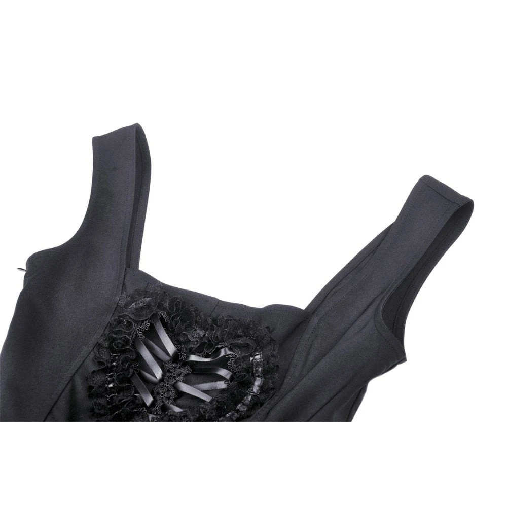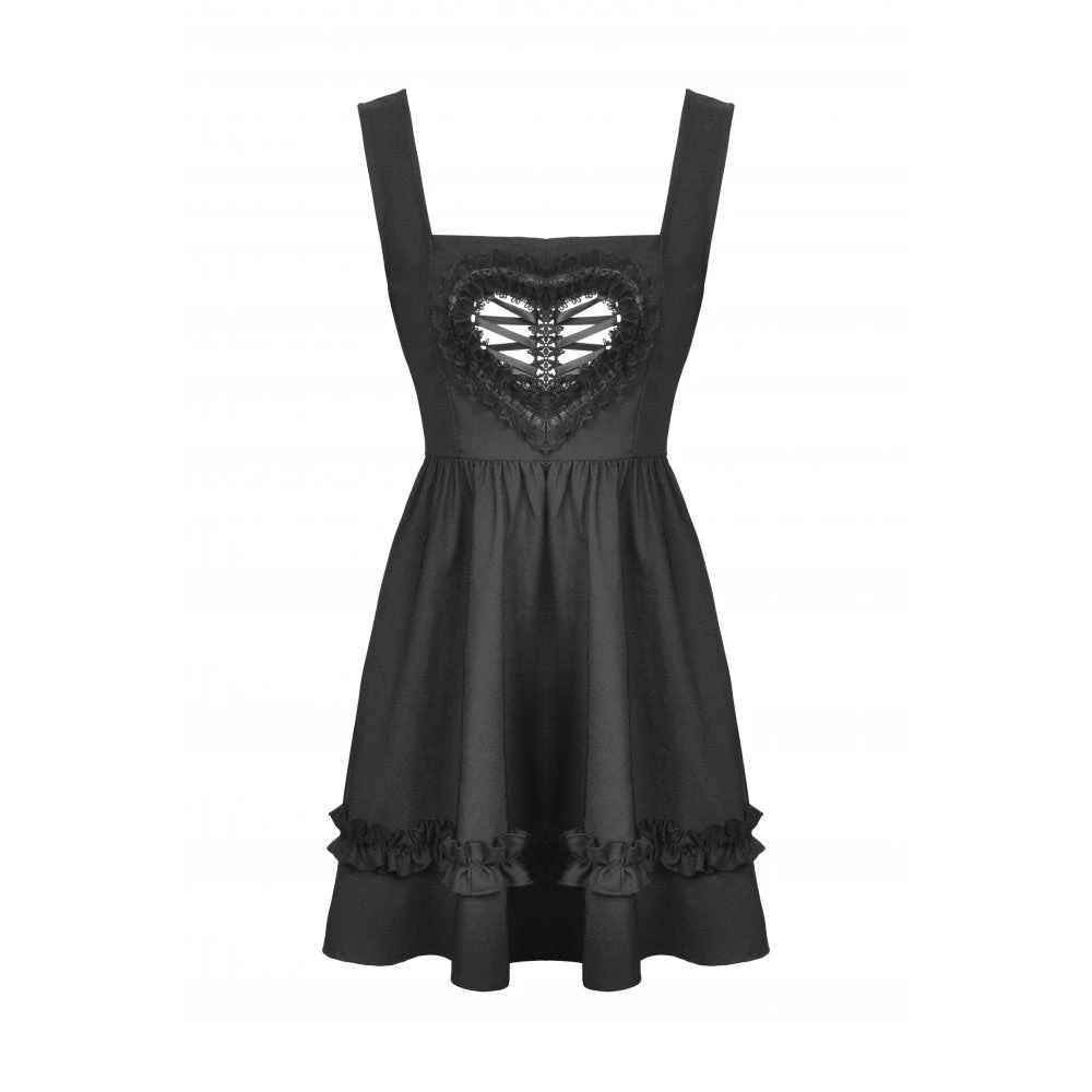 Wow your Valentine with this sexy black sleeveless mini dress with front heart cut with ribbon detailing out from Dark in Love. This elegant yet edgy black mini dress features a flowing skirt with ruffles, gathered in waist and slight stretch for the perfect fit! It also has a ribbon tie back and looks killer on a night styled with boots or heels!