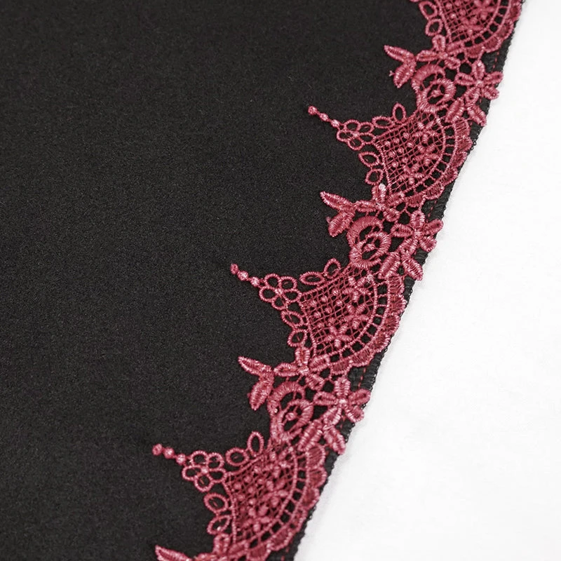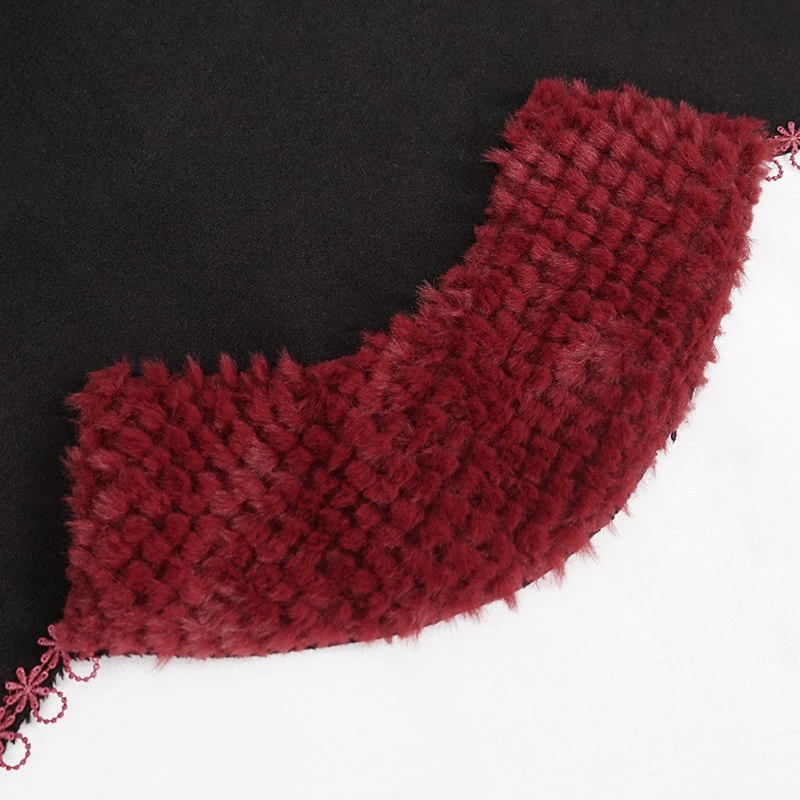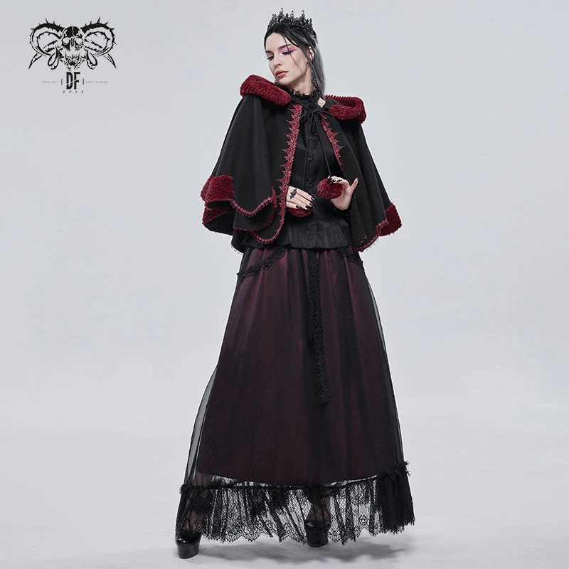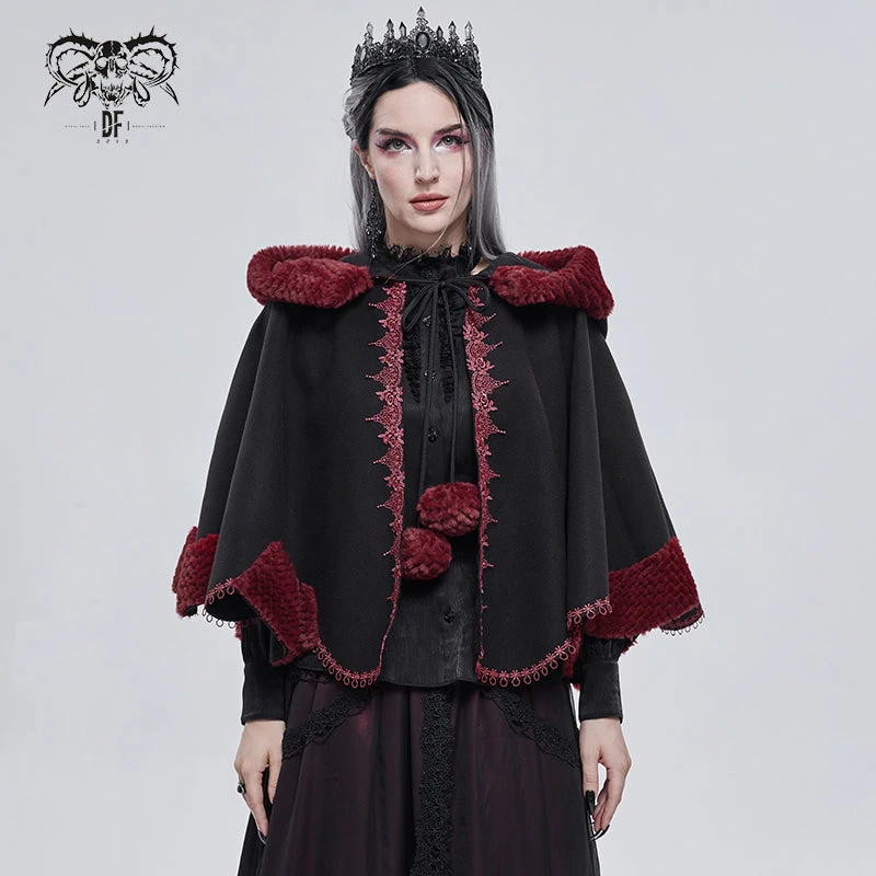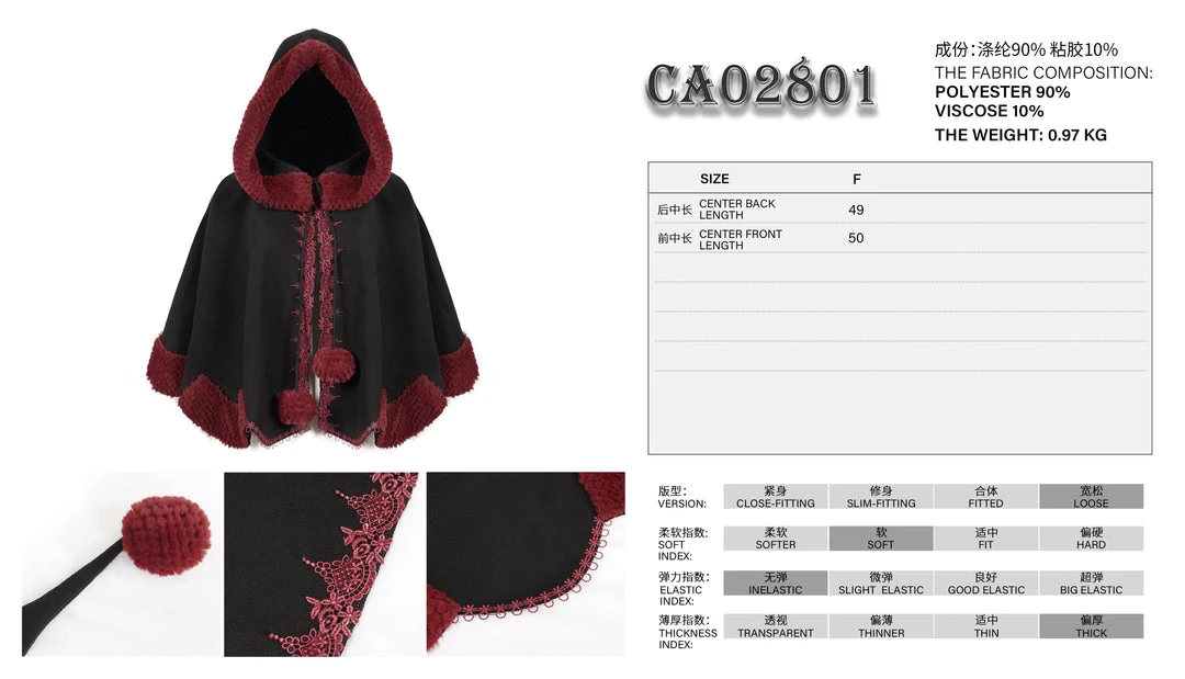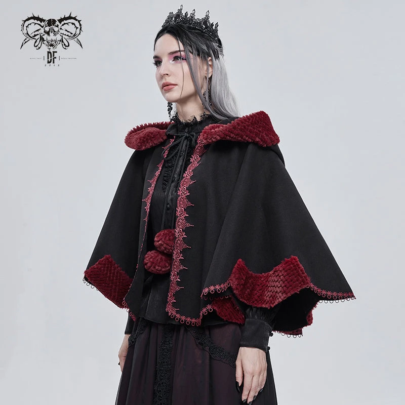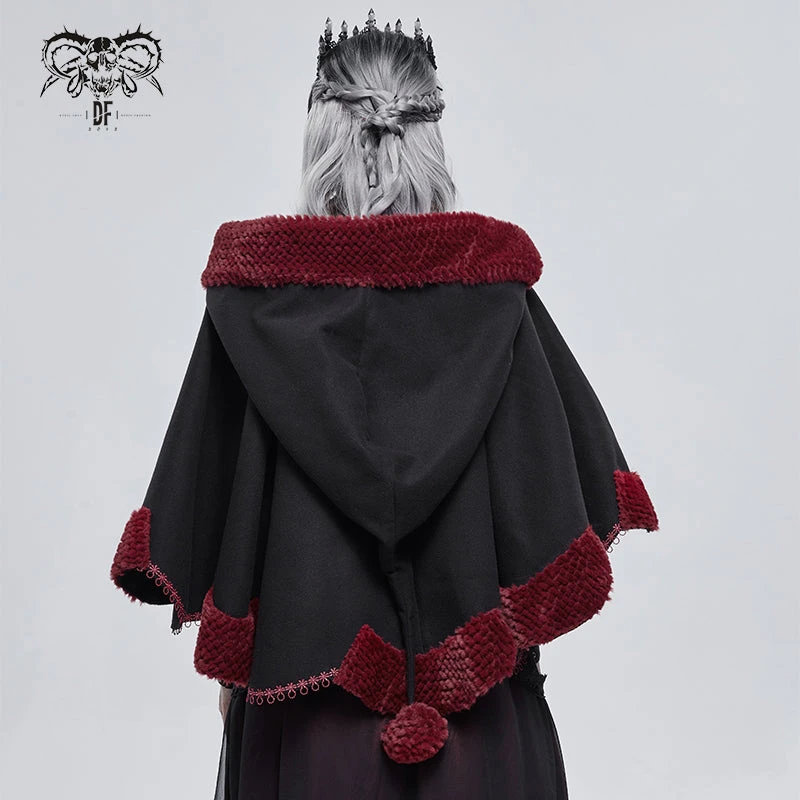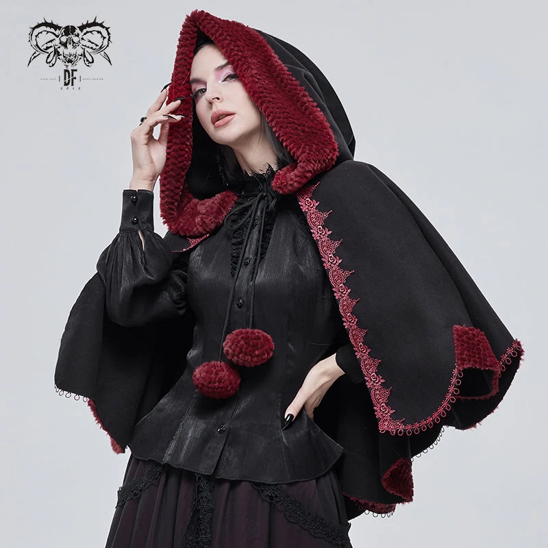 Luxurious black hooded cape with contrast red faux fur trims and embroidery. This visually stunning cape is made a loose fitting soft thick fabric that will keep you warm and look fabulous on!