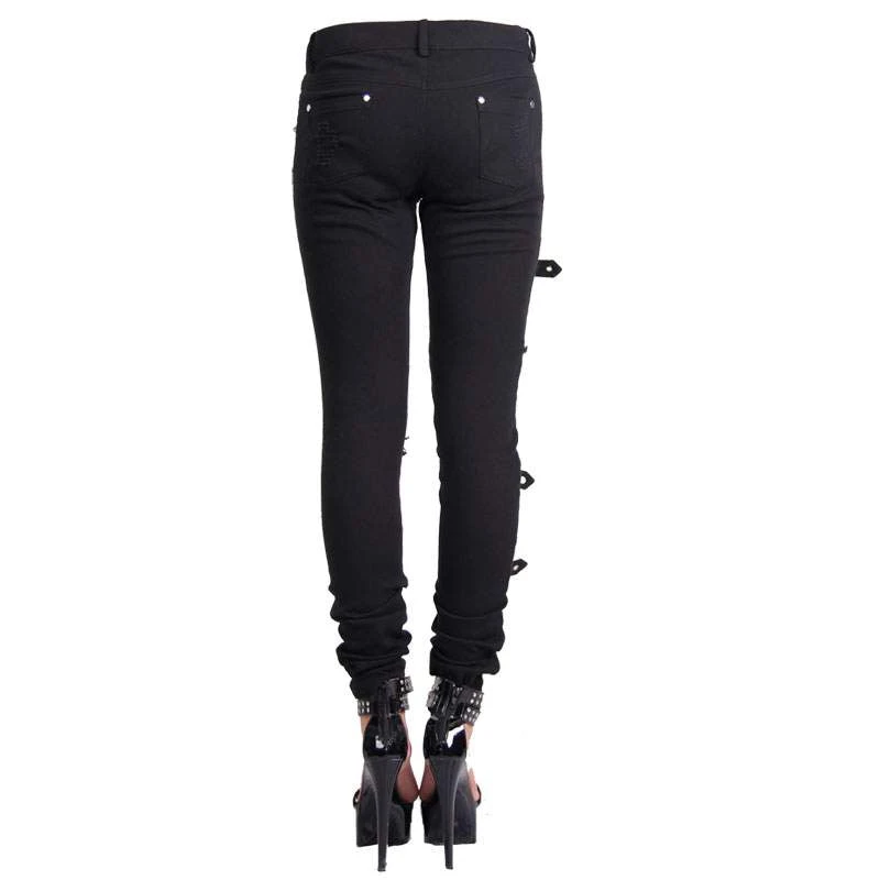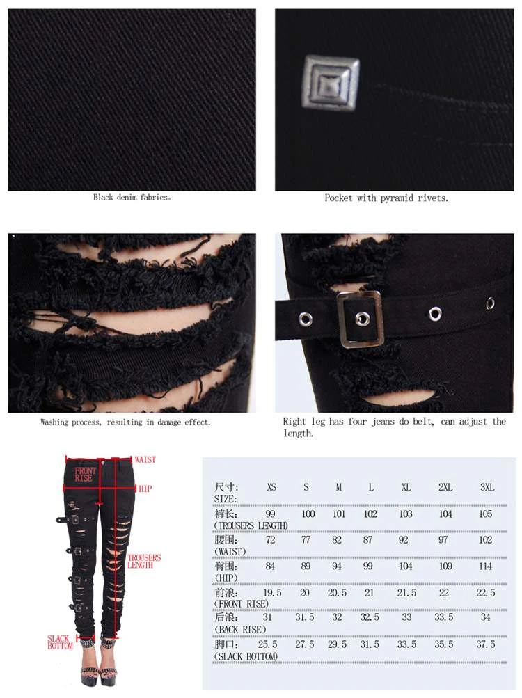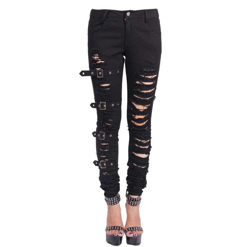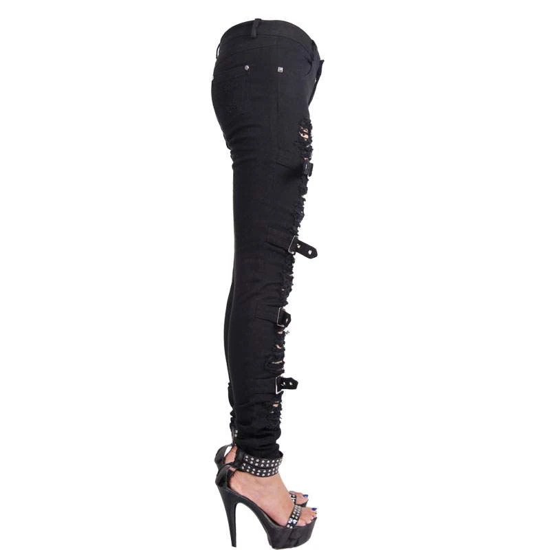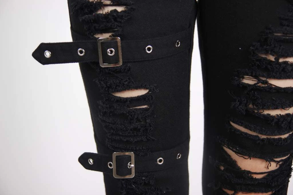 Fabulous pair of slim-fit ripped jeans from Devil Fashion! With front and back pockets, zip and button fastening, belt loops, belt and buckle accents and lots of ripped detailing on both legs.