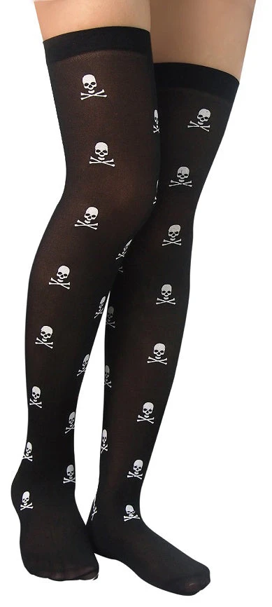Fantastic black stockings from Gothic Attitude with contrasting white skull and crossbones print.