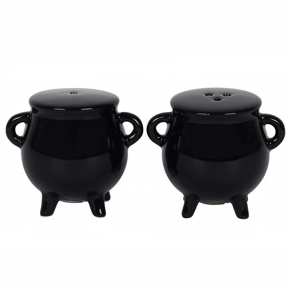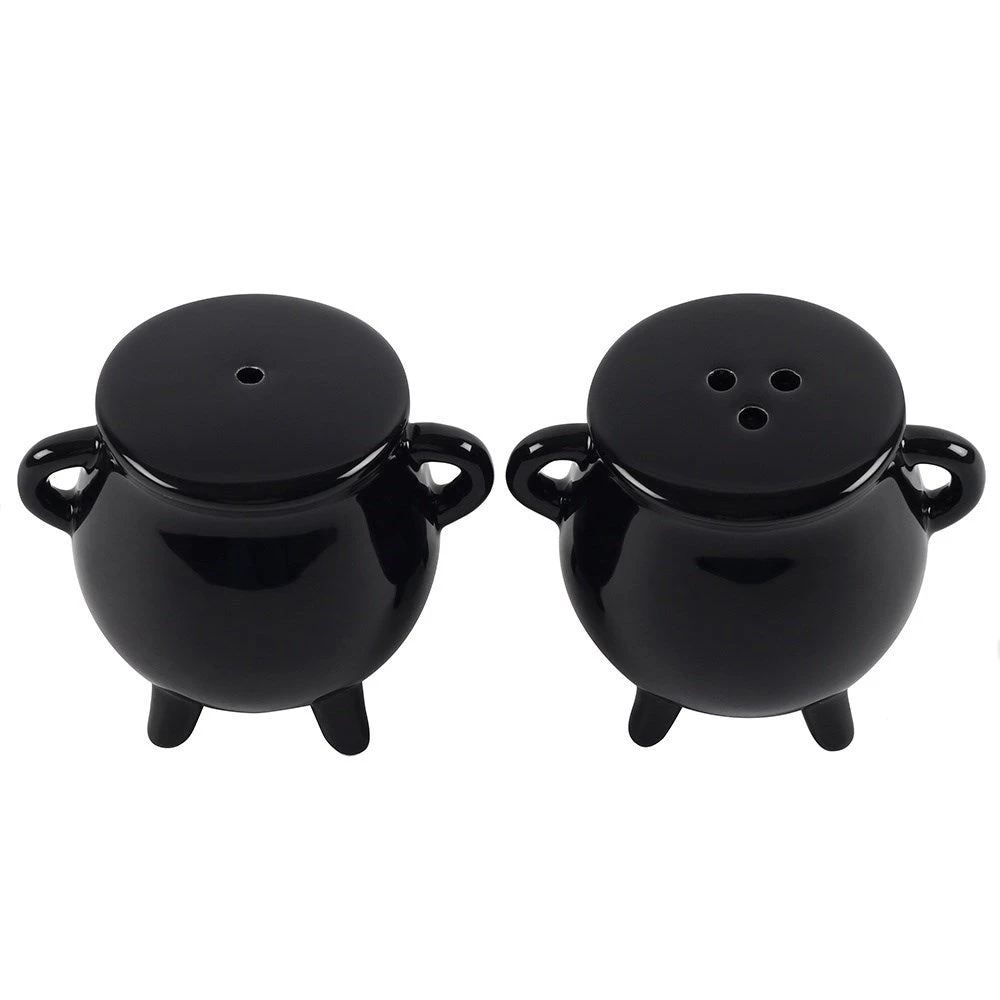 Super cute little pair of cauldron pots for salt and pepper, each with a rubber stopper bottom.