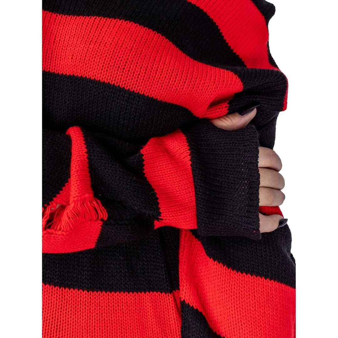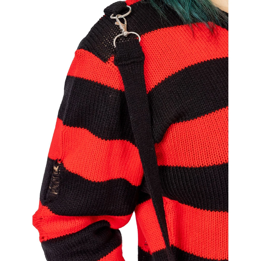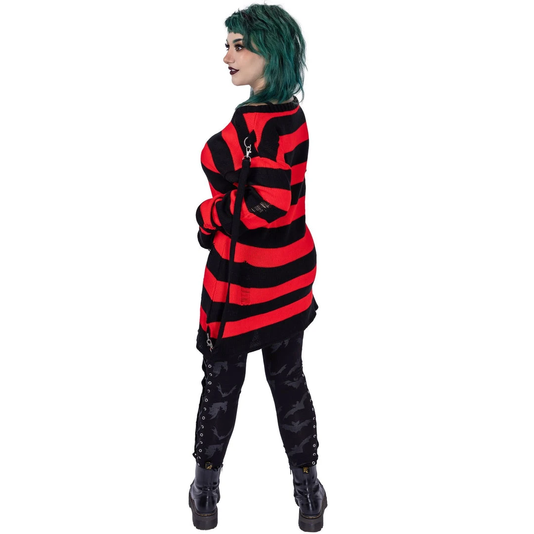 Gorgeous, soft overlong jumper from Heartless featuring black & red stripes, distress detailing, detachable bondage straps, thumb hole detail and a round neckline.