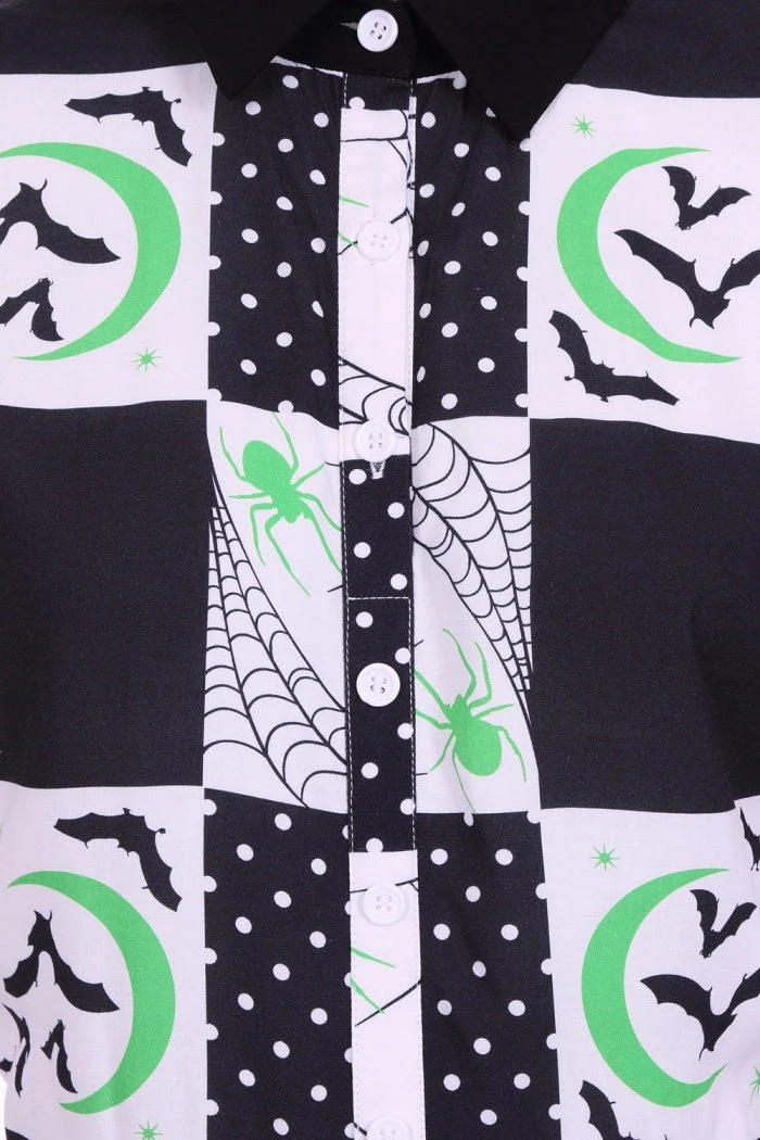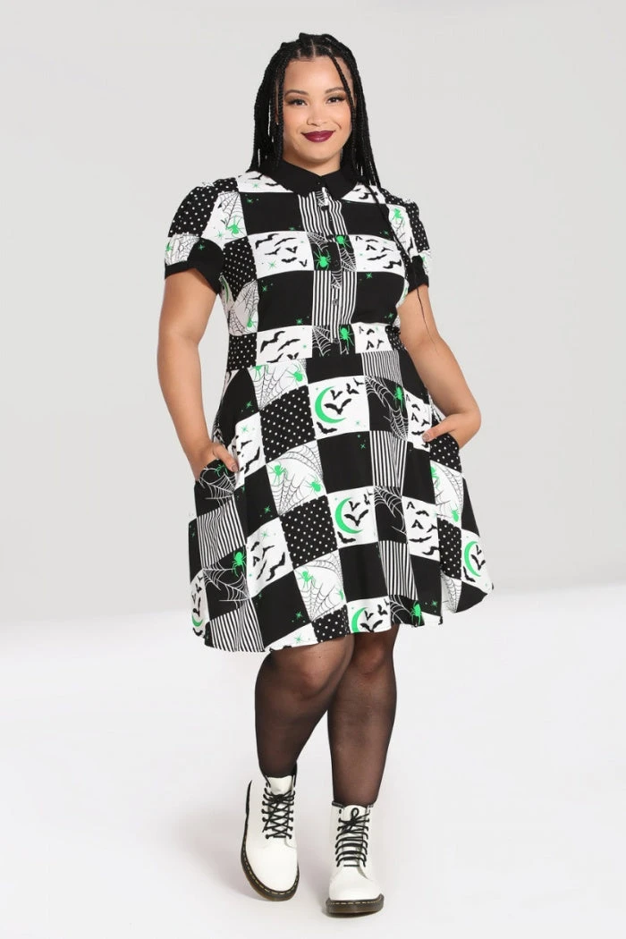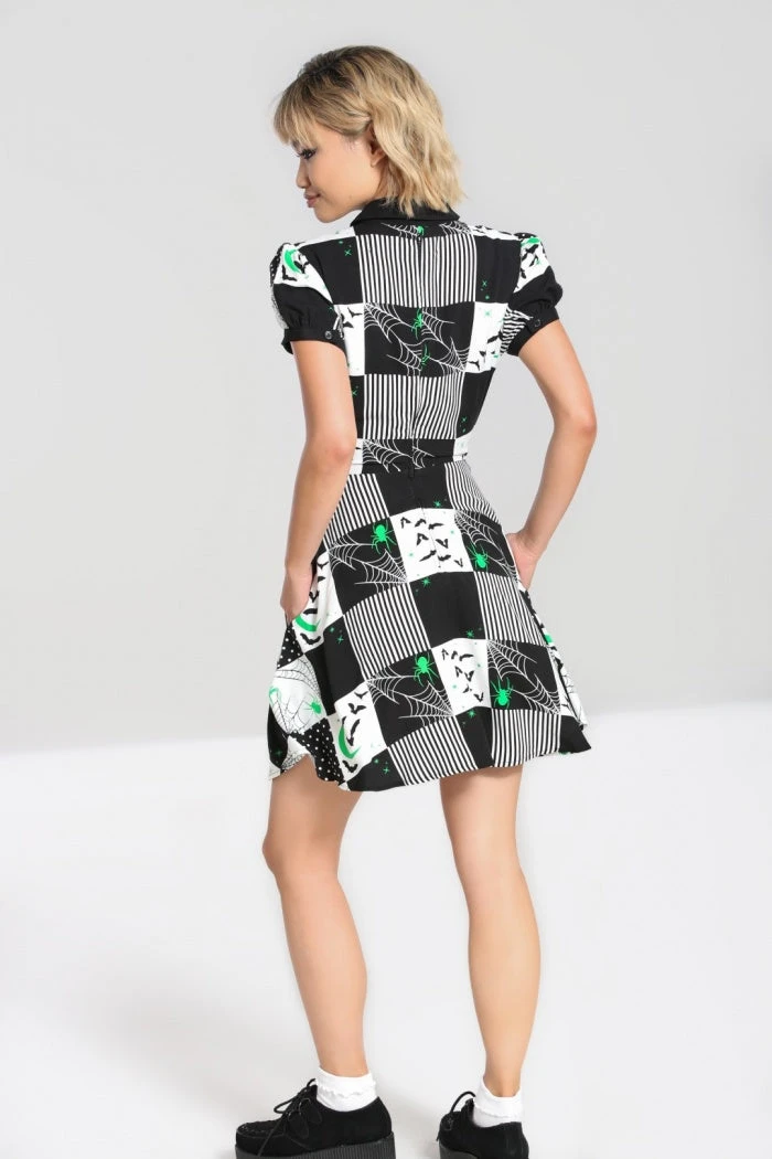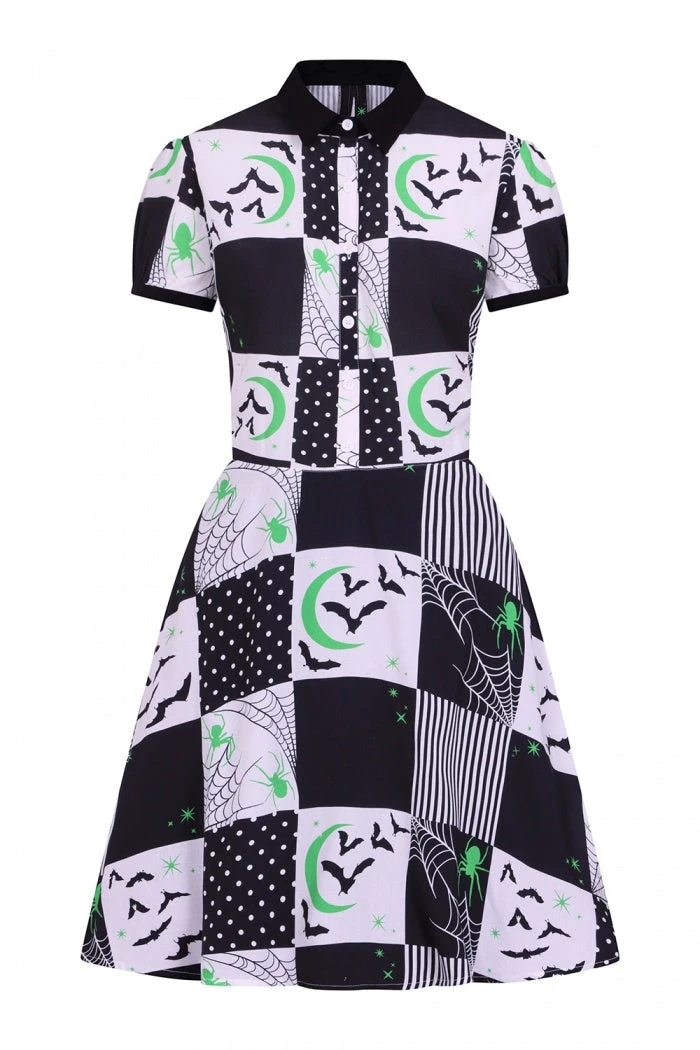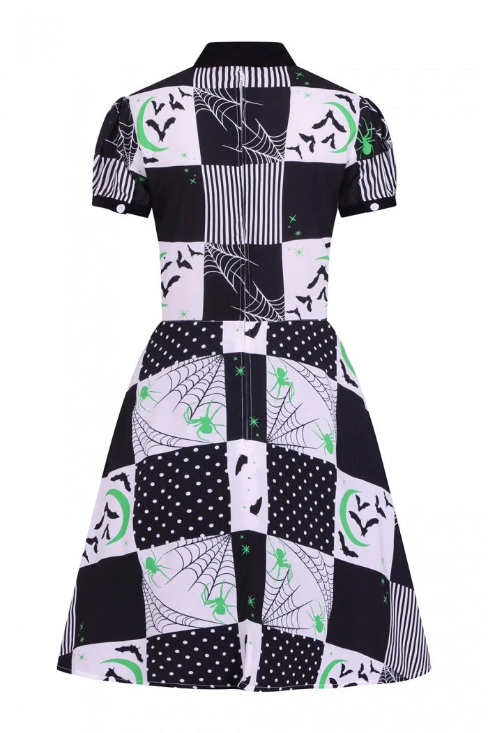 Stand-out black and white patchwork print mini dress with bright green contrast spooky print print from Hell Bunny. This awesome printed dress features cuffed short puff sleeves, statement black stand up pointed collar with front placket with buttons. This lovely dress is fitted at the waist and then flares out with back zip fastening. It looks great styled with high heels or chunky boots!