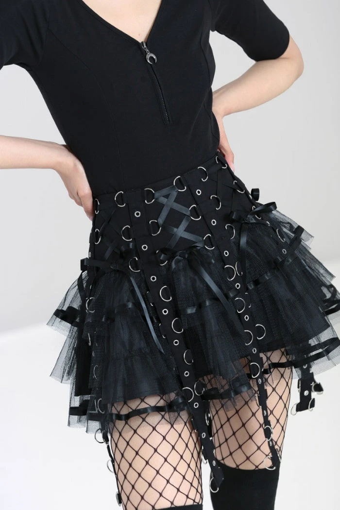 Gorgeous black tutu style mini skirt from Hell Bunny with hidden back zip fastening. This lovely skirt features a wide waistband to the hip and flares out from the mid hip with 3 layers of tulle plus lining for a tutu effect style. This amazing skirt also has long eyelet straps with D-ring detailing and corset style ribbon detailing and looks amazing on!