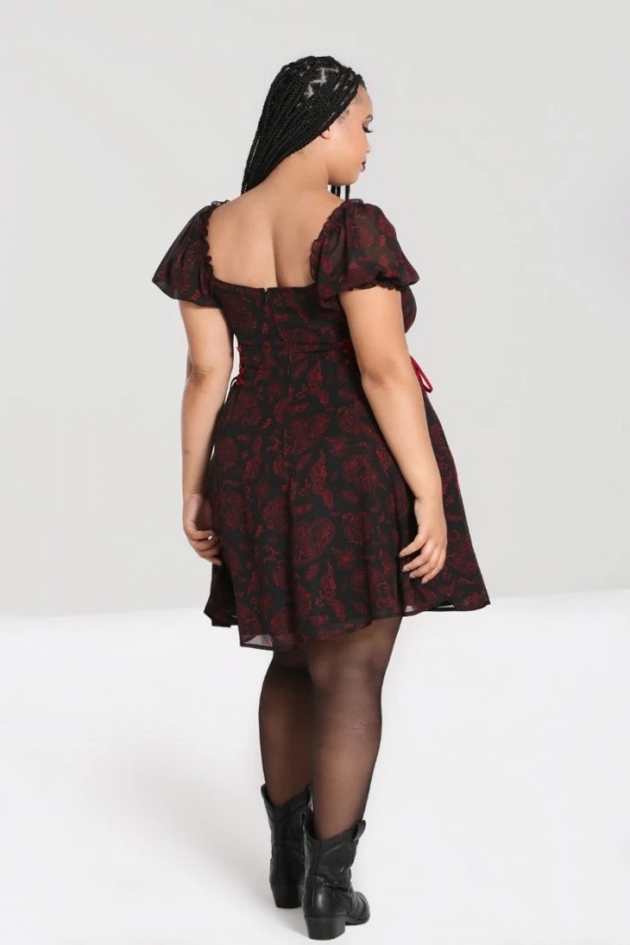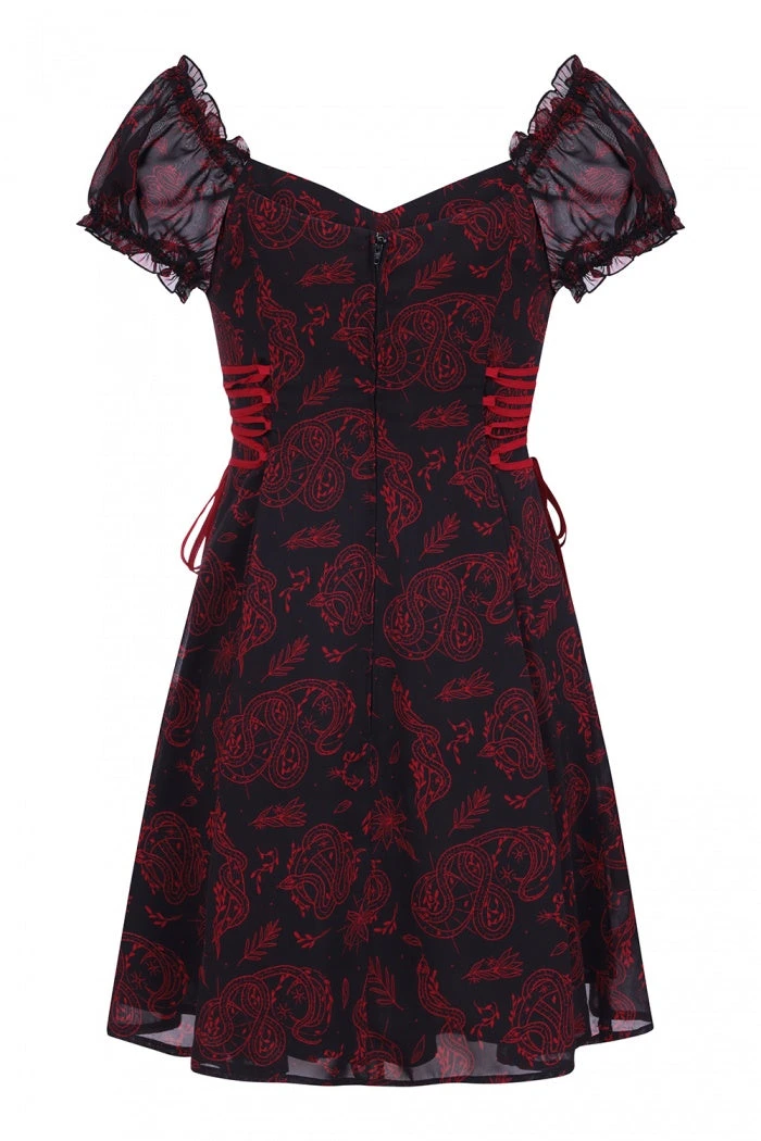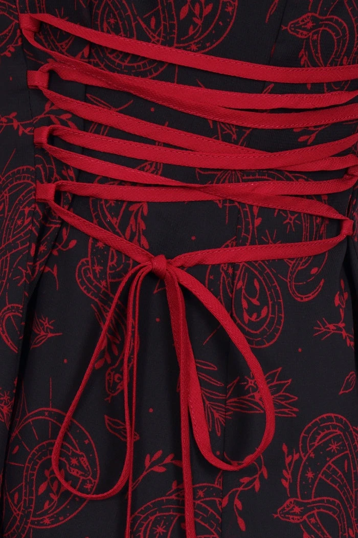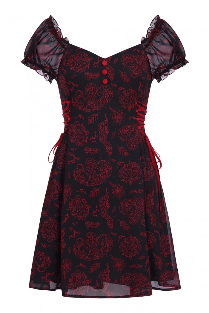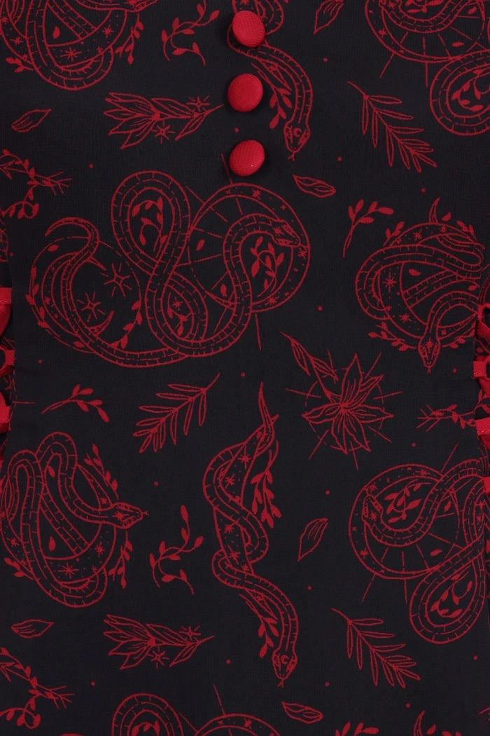 Gorgeous black chiffon maxi dress with red contrast snake and moon print from Hell Bunny. This awesome short sleeve dress features frills on the sleeves, ruffled V neckline with adjustable red lace up side detailing and centre buttons and fastens with a back zip. This lovely dress has an opaque black lining, is fitted at the waist and then flares out. It looks great dressed up or down!