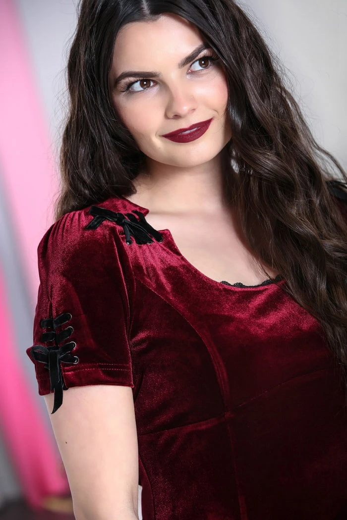 Gorgeous burgundy stretch velvet mini dress in a fit and flare style from Hell Bunny. This stunning dress features a low neckline with lace detailing and short. This stylish dress also features corset style lace up detailing on the shoulders and sleeves. This dress looks awesome with heels or chunky boots!
