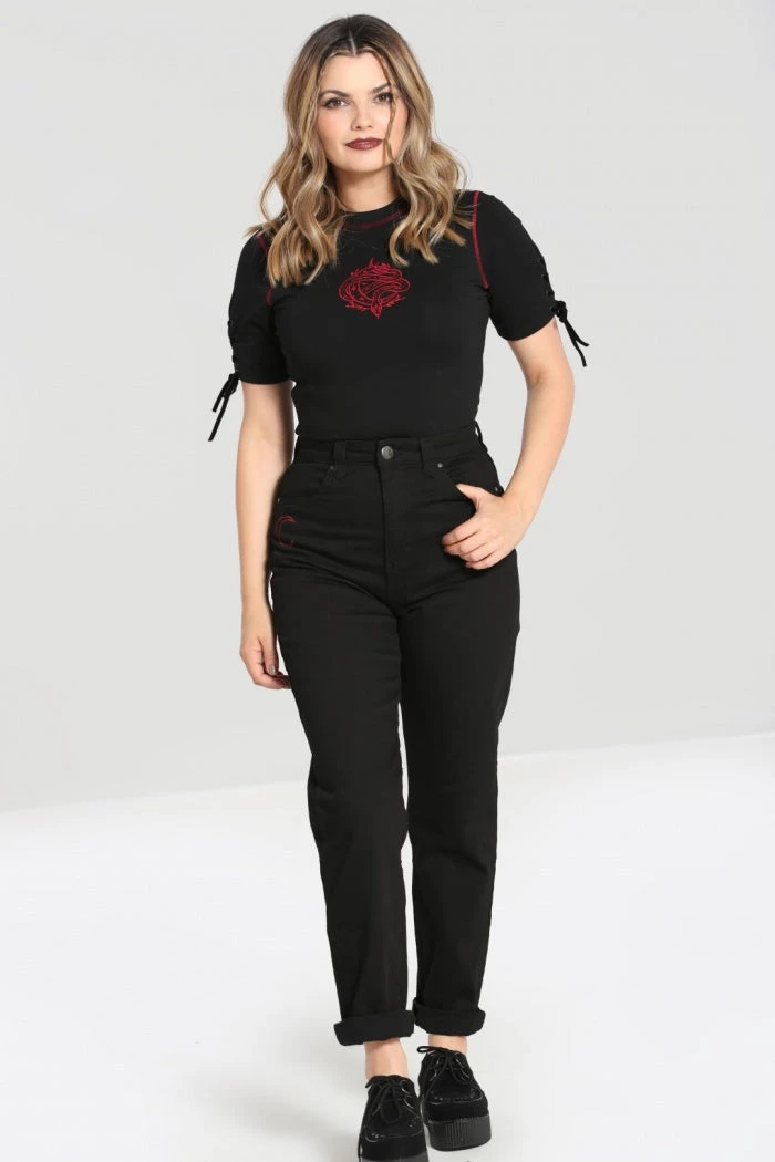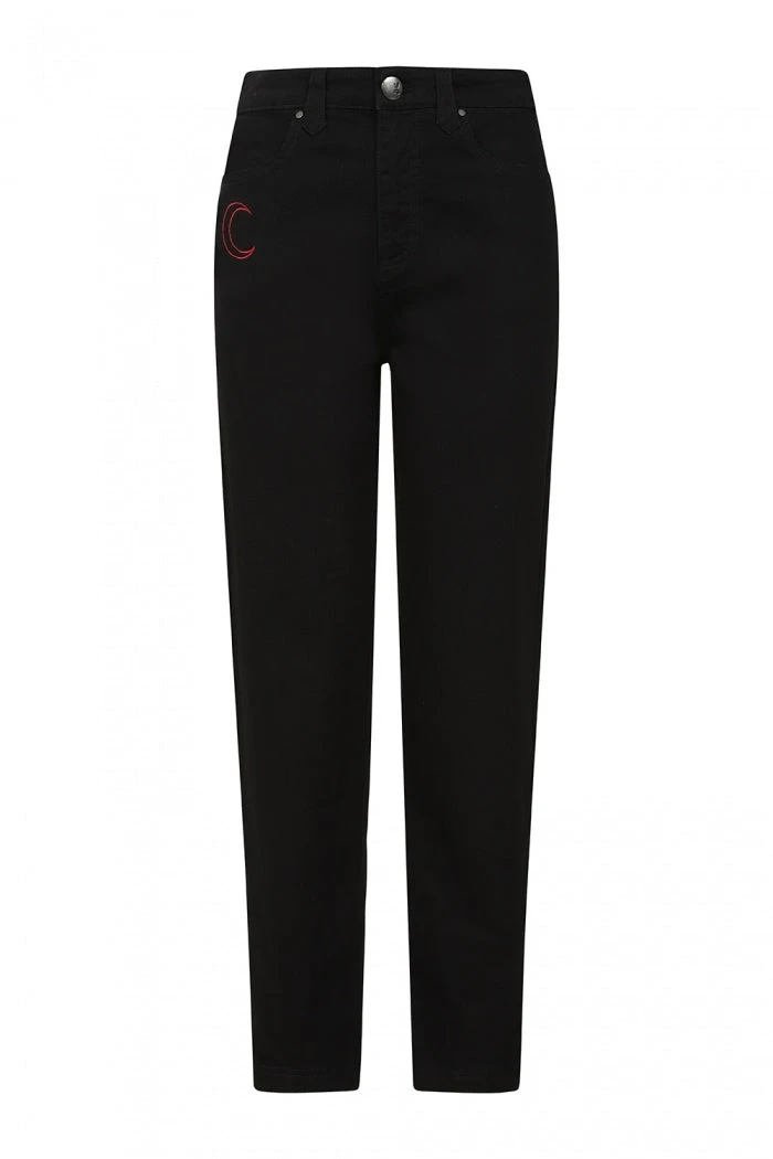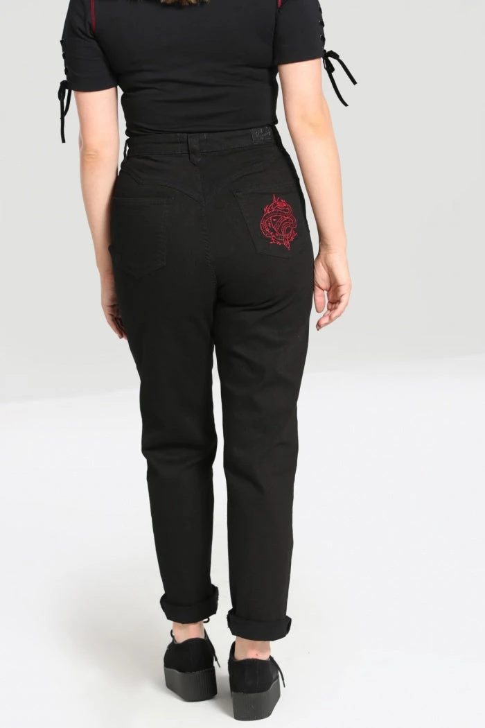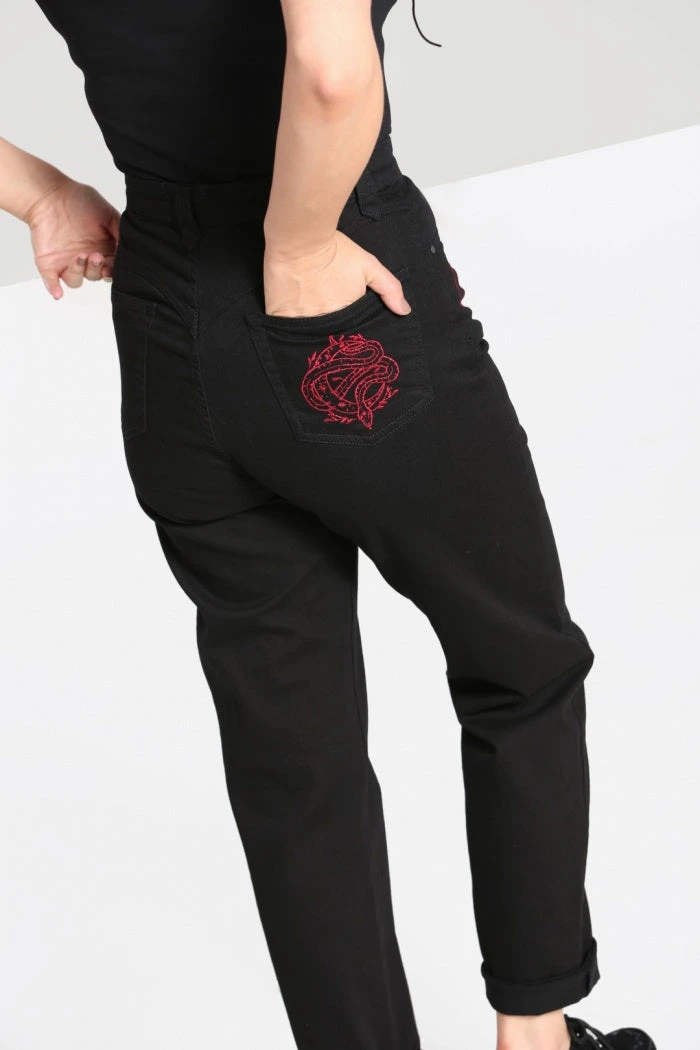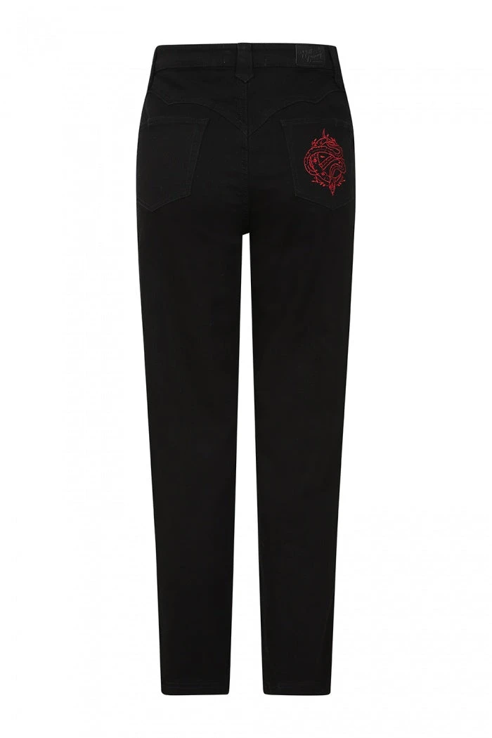 Stylish and versatile black jeans from Hell Bunny with red contrast moon and snake embroidery detailing. These must-have denim jeans feature belt loops, 2 front pockets and back pockets and have a tapered leg shape. These awesome black trousers are made from a slight stretch cotton fabric with metal button and zip fastening .