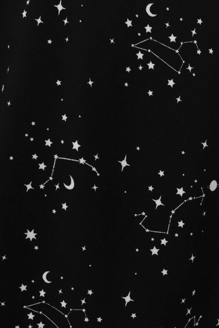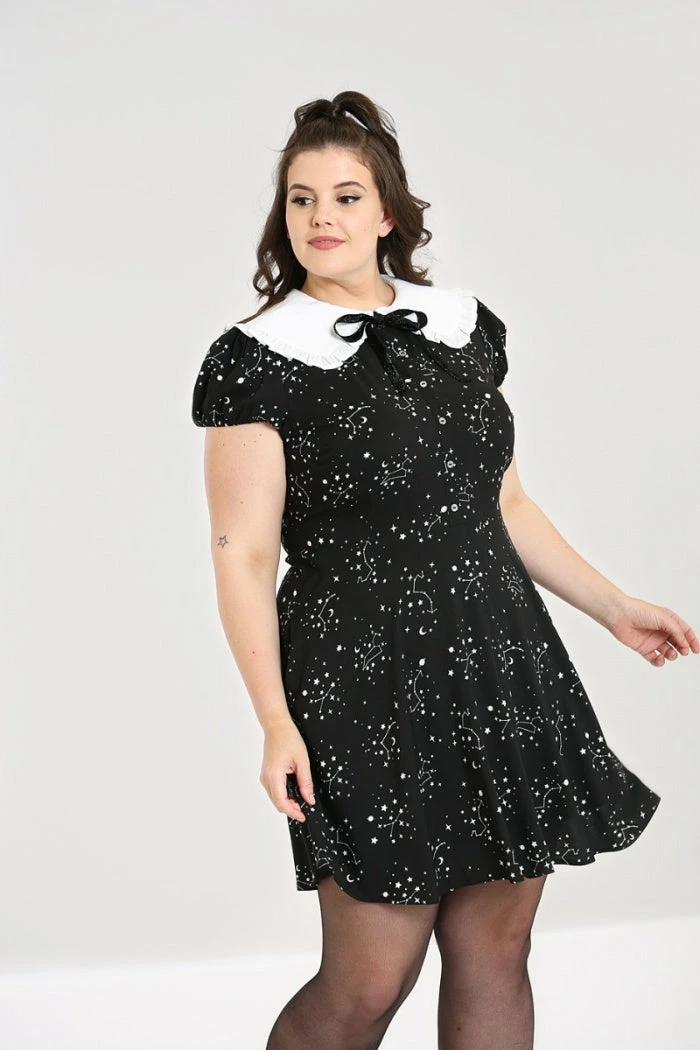 Stand-out black mini dress with white contrast celestial star print from Hell Bunny. This awesome monochrome dress features frills on the short cap sleeves, statement large white contrast collar with a removeable black glitter tie. This lovely dress is fitted at the waist and then flares out with convenient pockets in the side seams. It has a button up front and back zip fastening and looks great dressed up or down!