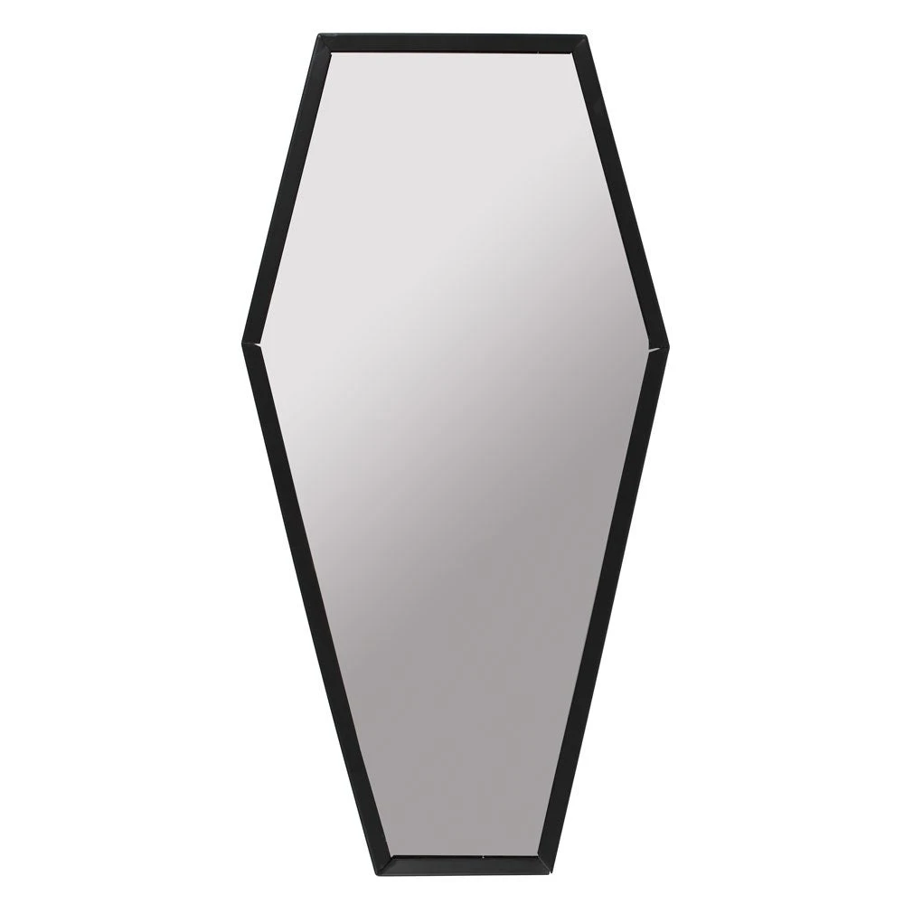Awesome coffin shaped glass mirror with metal frame. This lovely piece of homeware can be hung in the home or garden but best to keep out of harsh weather. Measures approximately 50 x 25 x1cm.