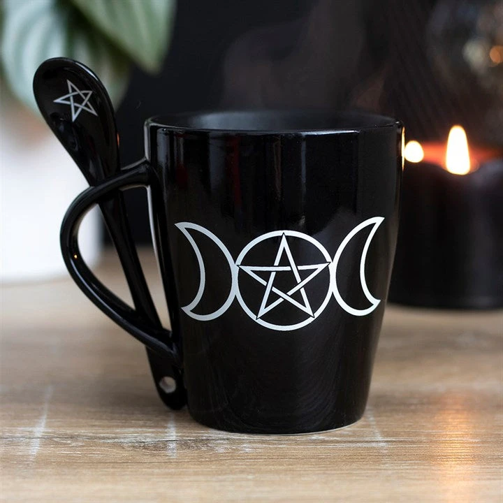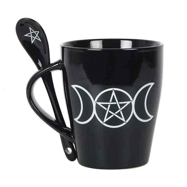 Perfect mug for someone magical in your life! This awesome black mug comes with matching teaspoon which fits into the handle. This lovely mug and teaspoon set features a white contrast triple moon and pentagram print. Makes an awesome gift!