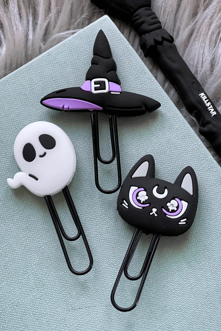 Spookily cute novelty paper clips with ghost, witch hat and cat designs. A must-have for your office supplies! Also makes a fabulous gift!