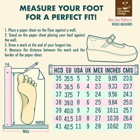 Chocolaticas® Havana Mary Jane Flat Shoes. These gorgeous shoes are proudly vegan with a lovely monochrome design. With a non-marking rubber sole, you can enjoy the comfort of a cushioned inner sole. You’ll fall in love with these stunning shoes which feature an adjustable buckle and printed fabric upper. Check HCD’s size guide in the images for the right fit for you.