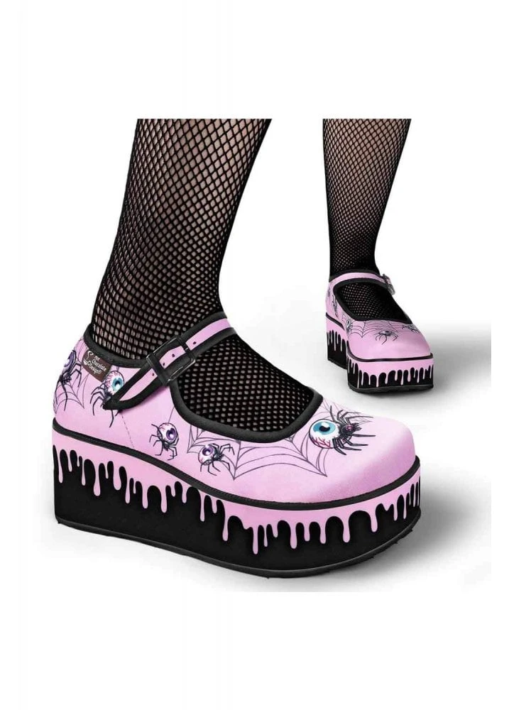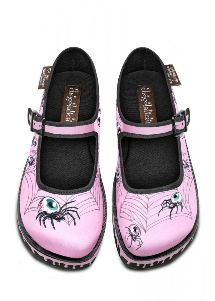 Chocolaticas Pink Widow Mary Jane Platform. These elegant yet quirky shoes are proudly vegan with a stunning pink spider design. Elevate your look with the 5.5cm/2.2″ platform rubber sole and enjoy the comfort of a cushioned inner sole and arch support. You’ll fall in love with these stunning shoes which feature an adjustable buckle and vibrant printed fabric upper. Please see HCD’s size guide in the images for that perfect fit.