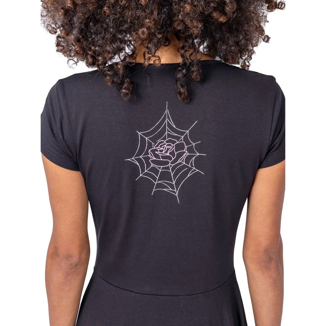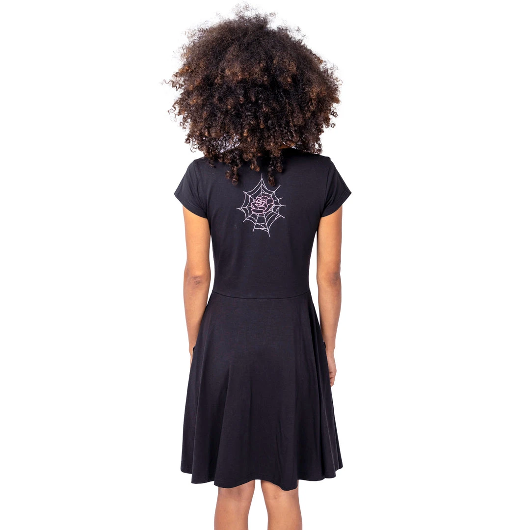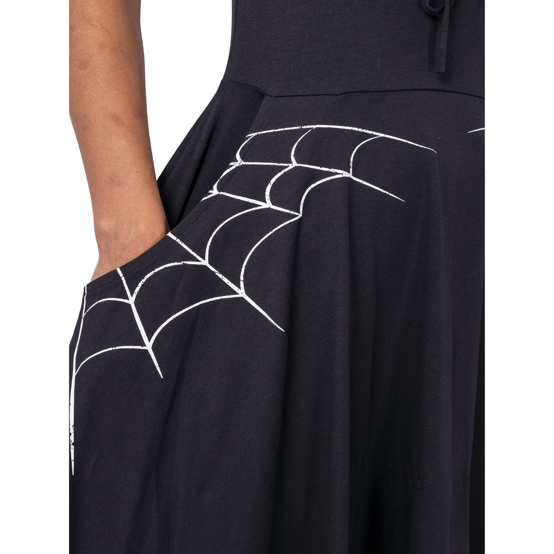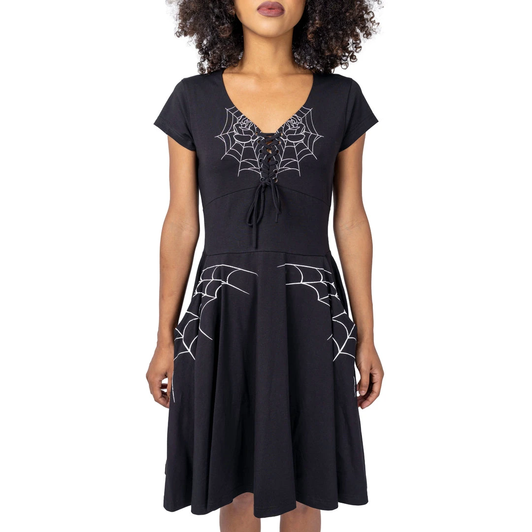 Stunning black short sleeved dress from Innocent with white contrast spiderweb print. This must-have knee length dress features pockets and lace up detailing on the front. Made from a soft stretch cotton fabric that is fitted to flatter your figure with an elegant flowing skirt. Looks awesome paired with chunky boots or your favourite heels!