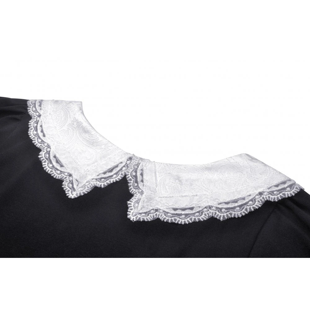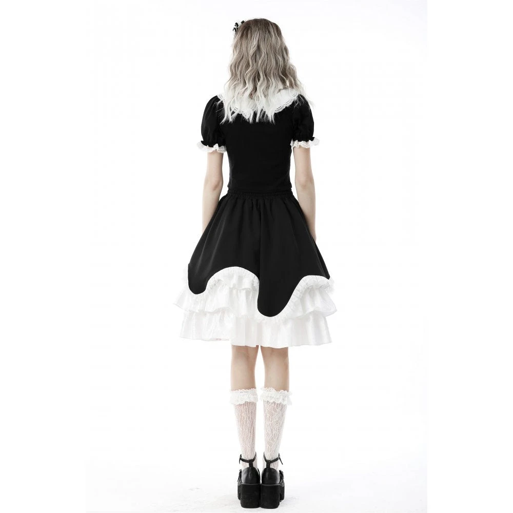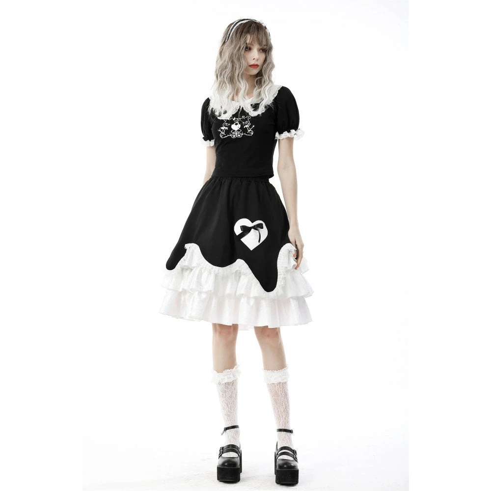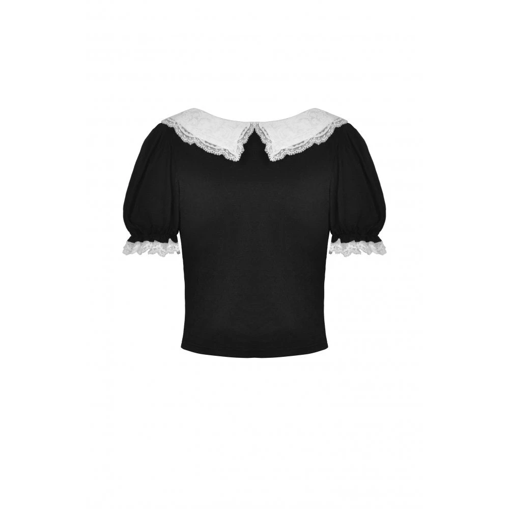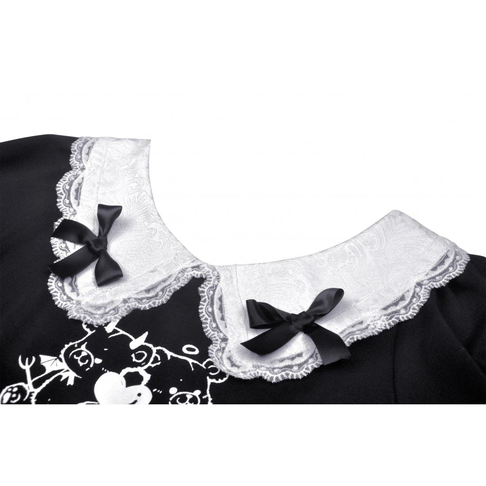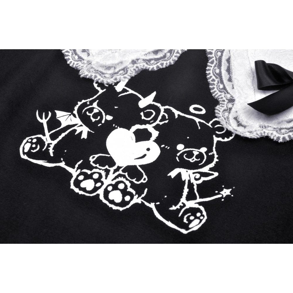 Playful black and white blouse by Dark In Love with a white contrast 2 Bears print. This classic black short sleeve blouse features elegant details such as a large white lace collar and trims on the short sleeves! This gorgeous top is made from a slightly stretchy fabric and is fitted to show off those curves!