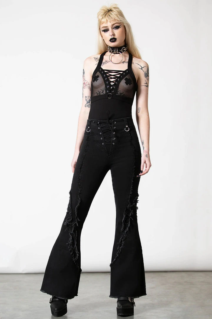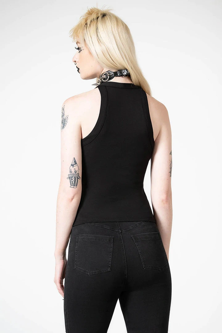 Absolutely stunning black halter top from Killstar! This black top is made from a soft medium stretch fabric with a lace up front, low neckline and fishnet panels with metal hardware.