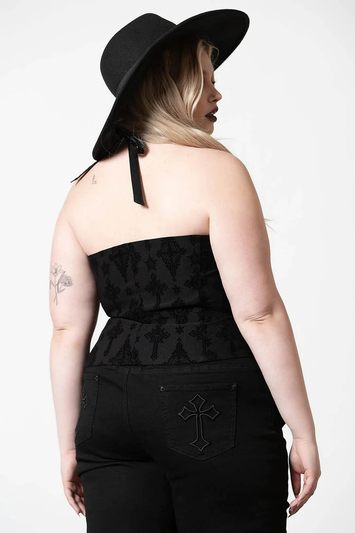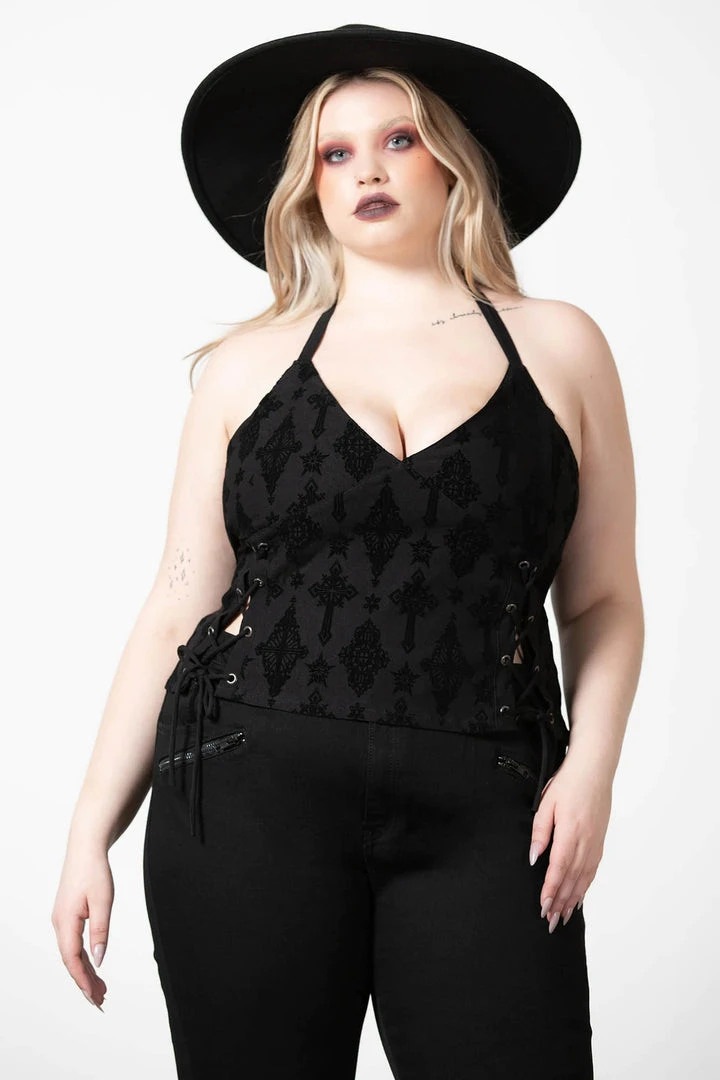 Gorgeous black halter top from Killstar is made from a super soft stretchy fabric with tie closure that is fitted for for statement body-hugging style. This must-have top also features a flocked cross pattern, and V neck for stand out style with a vintage gothic feel!