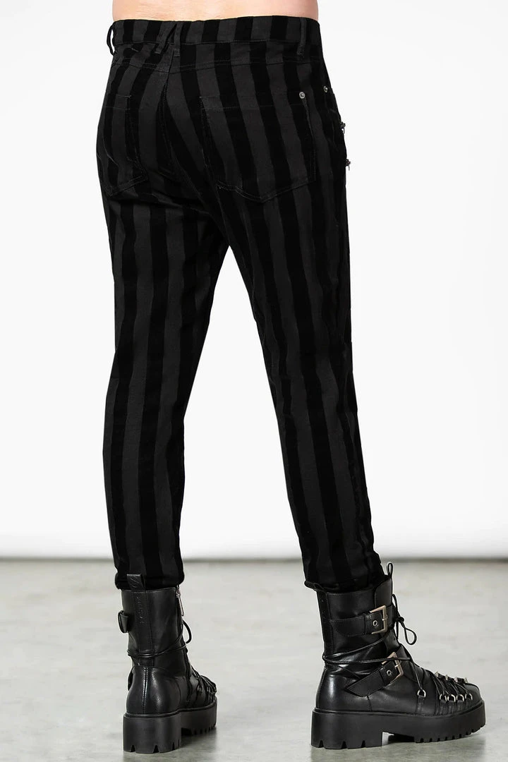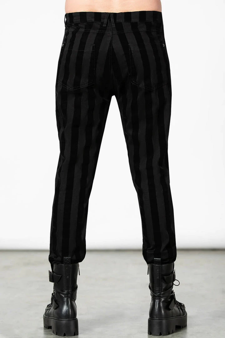 Stylish and versatile black trousers from Killstar! These awesome black trousers are fitted with pockets, belt loops and button and zip closure. Made from a soft black stripe flocked denim fabric with zip detailing and easy to dress up or down according to your mood!