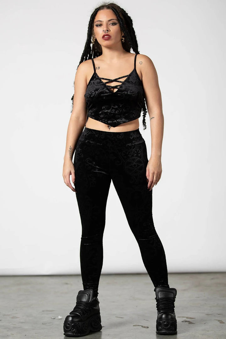 Amazing black strappy vest top by Killstar that is made from a luxurious stretchy burnout velvet fabric that will show off those curves. This gorgeous top features a low v neckline with statement strap detailing and is slightly cropped with a V shaped hem. Looks stunning dressed up or down!
