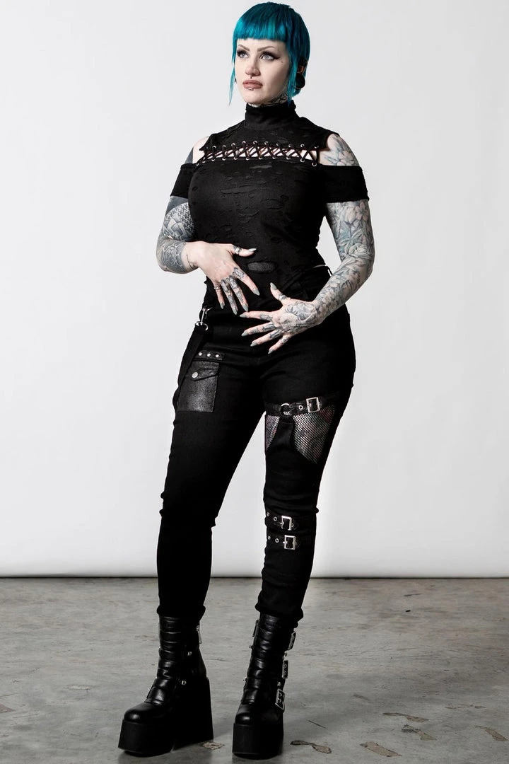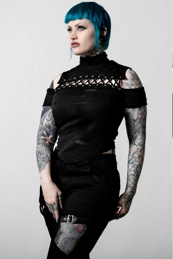 Stunning short sleeved black top from Killstar that is made from a soft stretchy fabric, slightly cropped and fitted to flatter your figure! This amazing black top features cold shoulders, lace up front and high neck. This top will add some edge to your outfit and looks great whatever you pair it with!