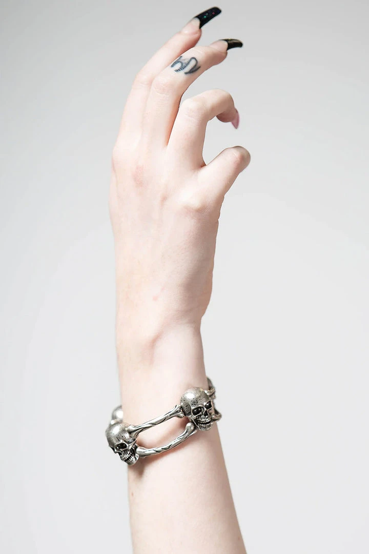 Stunning bracelet featuring sculpted bones and silver metal skulls! Made from high quality, reinforced metal, this captivating skull bracelet is the perfect addition to your jewellery collection!