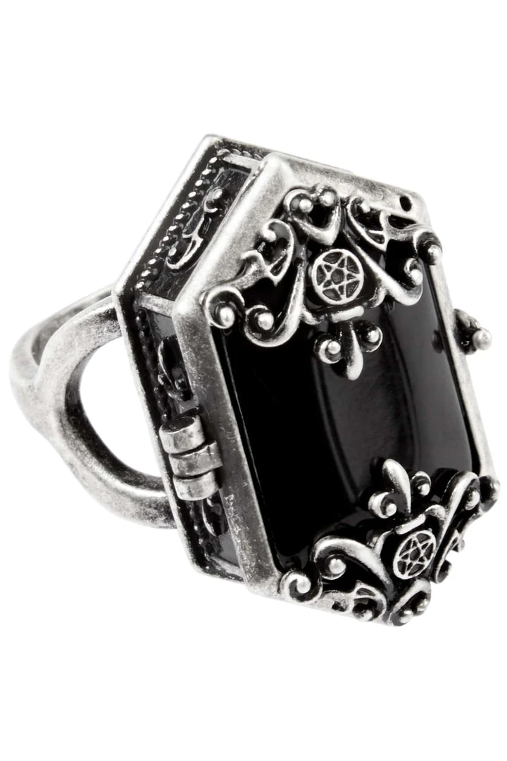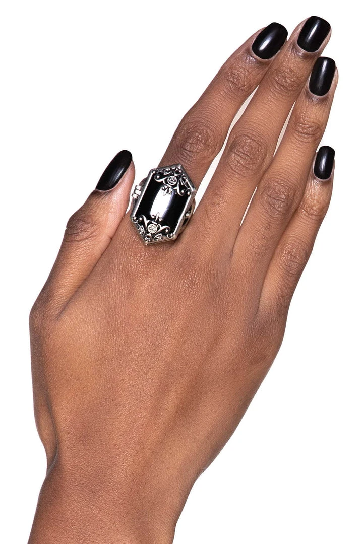 Killstar Eliza Silver Poison Ring features a dramatic black crystal in a darkened silver setting. This must-have accessory features ornate detailing with large 2.3cm/0.8″ feature.