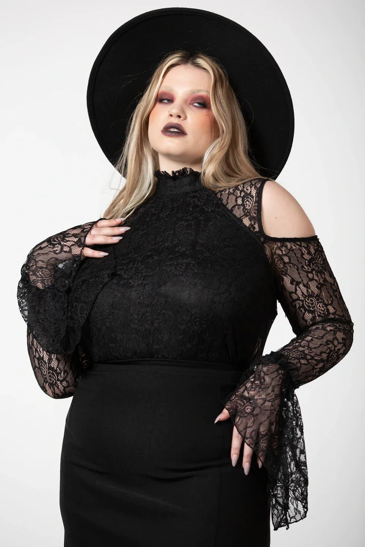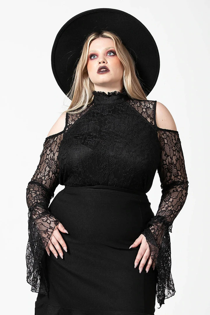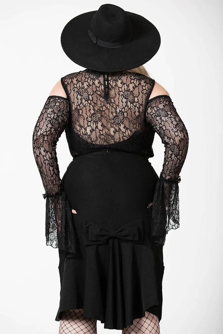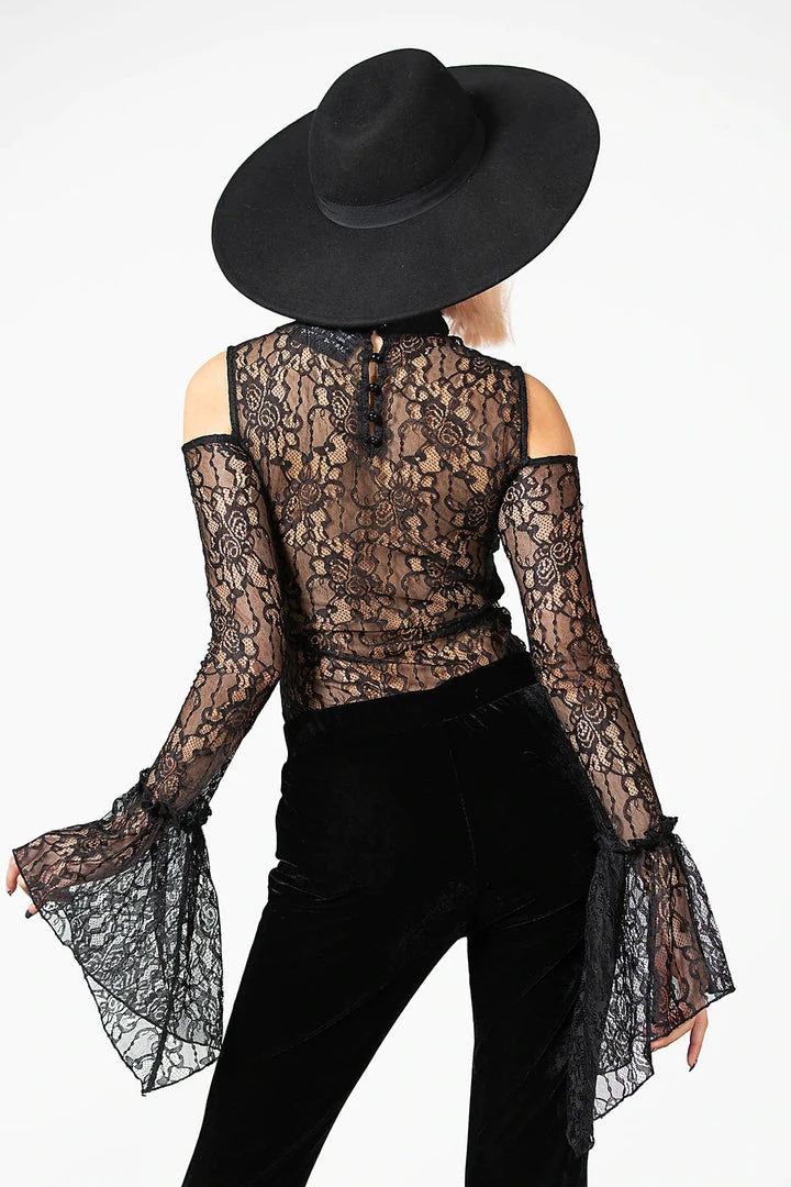Gorgeous and seductive long sleeve top from Killstar is made from a luxurious lace fabric for an elegant flattering look. This dreamy lace top features a front modesty panel and see-through back and sleeves. It also features a high neckline with ruffled edges, cold shoulders and statement bell sleeves for the ultimate romantic style!