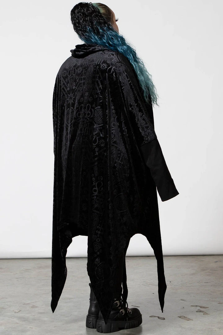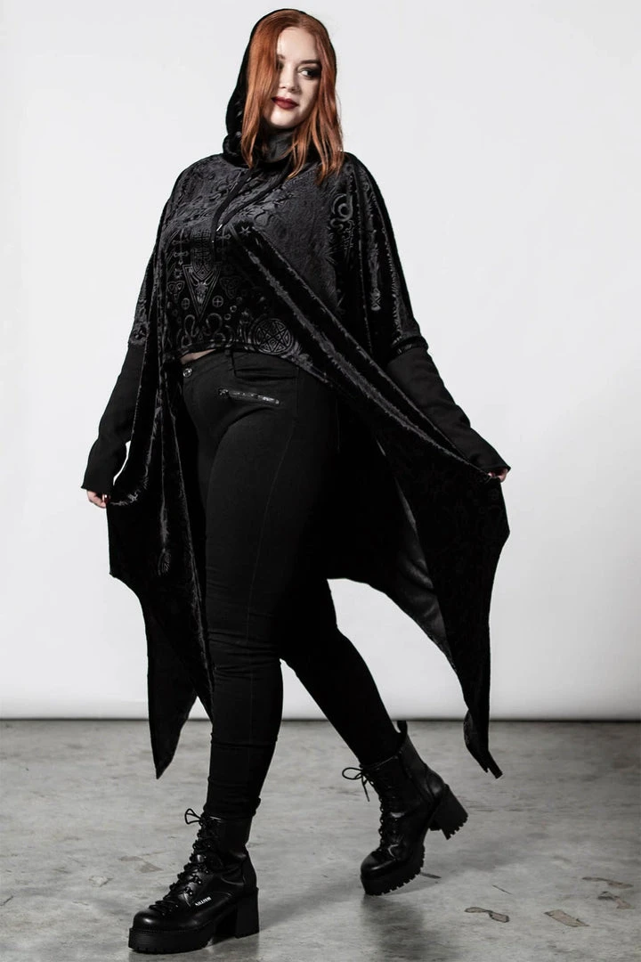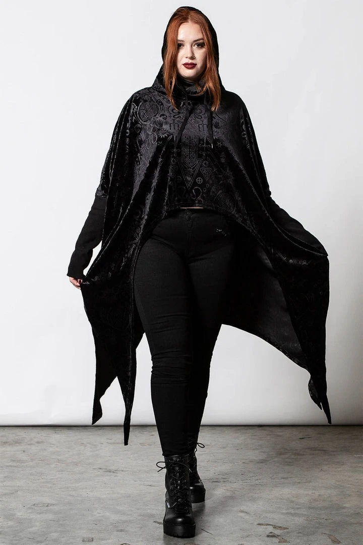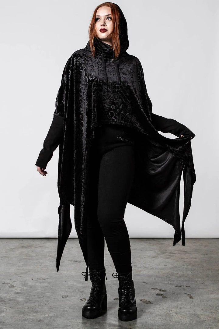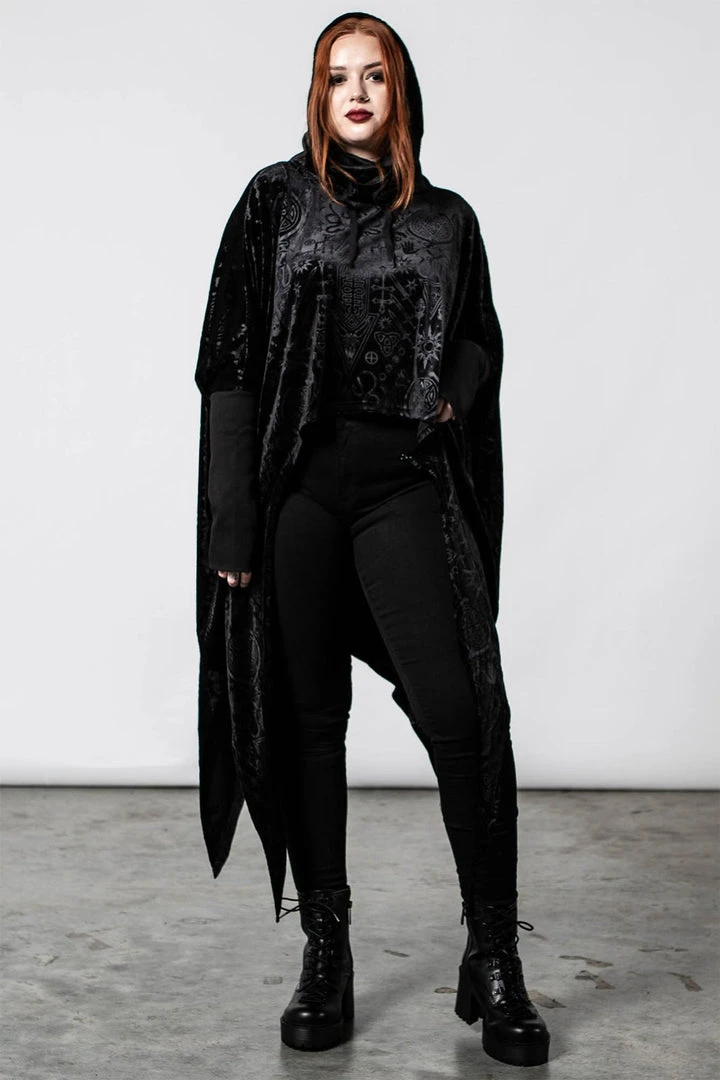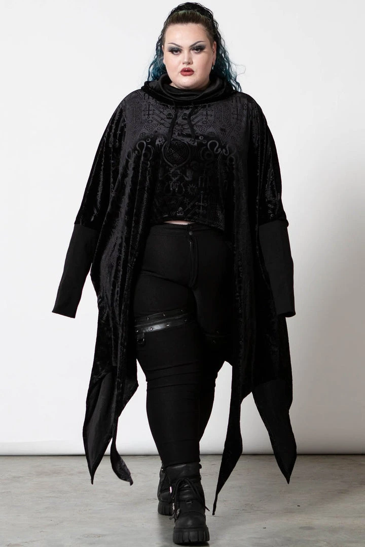 Stylish and comfortable long black hoodie, made from a luxury embossed velvet fabric in a relaxed fit that drapes to perfection! This must-have black pullover features an oversized hood, long sleeves and a hanky hem. Not your average black sweater, this looks amazing dressed up or down!