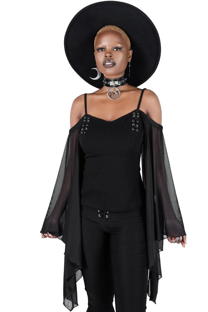 Gorgeous romantic black long sleeved top from Killstar with bardot neckline and thin straps! This beautiful and elegant top is made from a super soft stretchy fabric which is fitted to show off those curves! This stunning black top also features long statement waterfall mesh sleeves and lace up details. Looks amazing on!