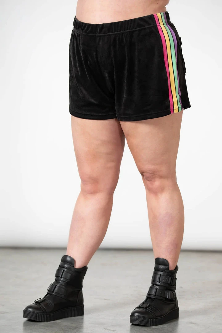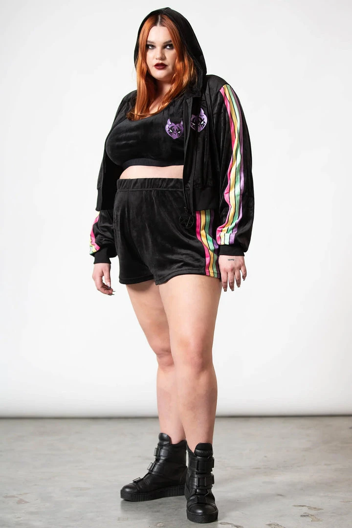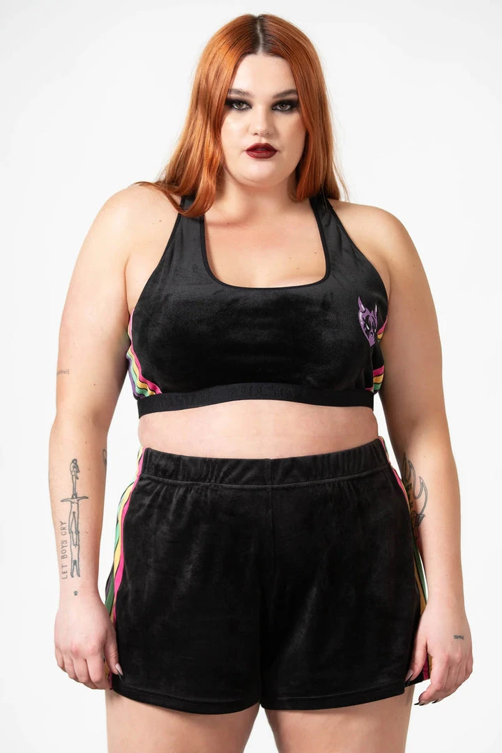 Must-have black velour shorts with elasticated waistband from Killstar made from a luxury stretch soft touch velour that are fitted to flatter your figure! These casual yet cool black velvet shorts are both comfy and stylish with statement embroidery on the back and rainbow stripe side panels! Match perfectly with the Groovy bralet : Buy both for the ultimate loungewear set!