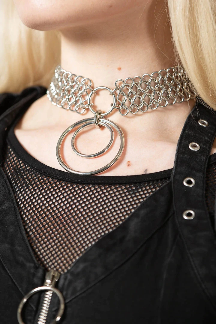 Edgy silver chainmail style choker by Killstar that is made from metal with accent O-ring detail. Complete your look with this provocative choker with adjustable size and clasp closure!