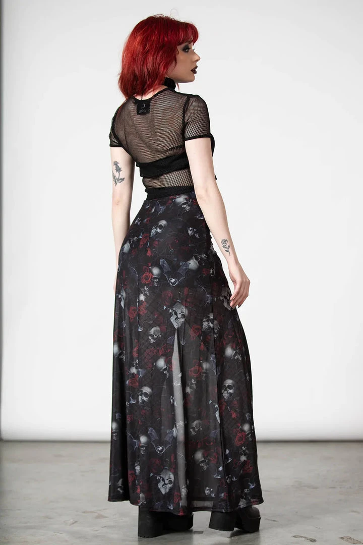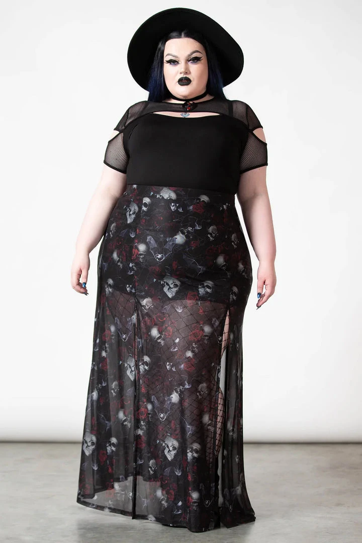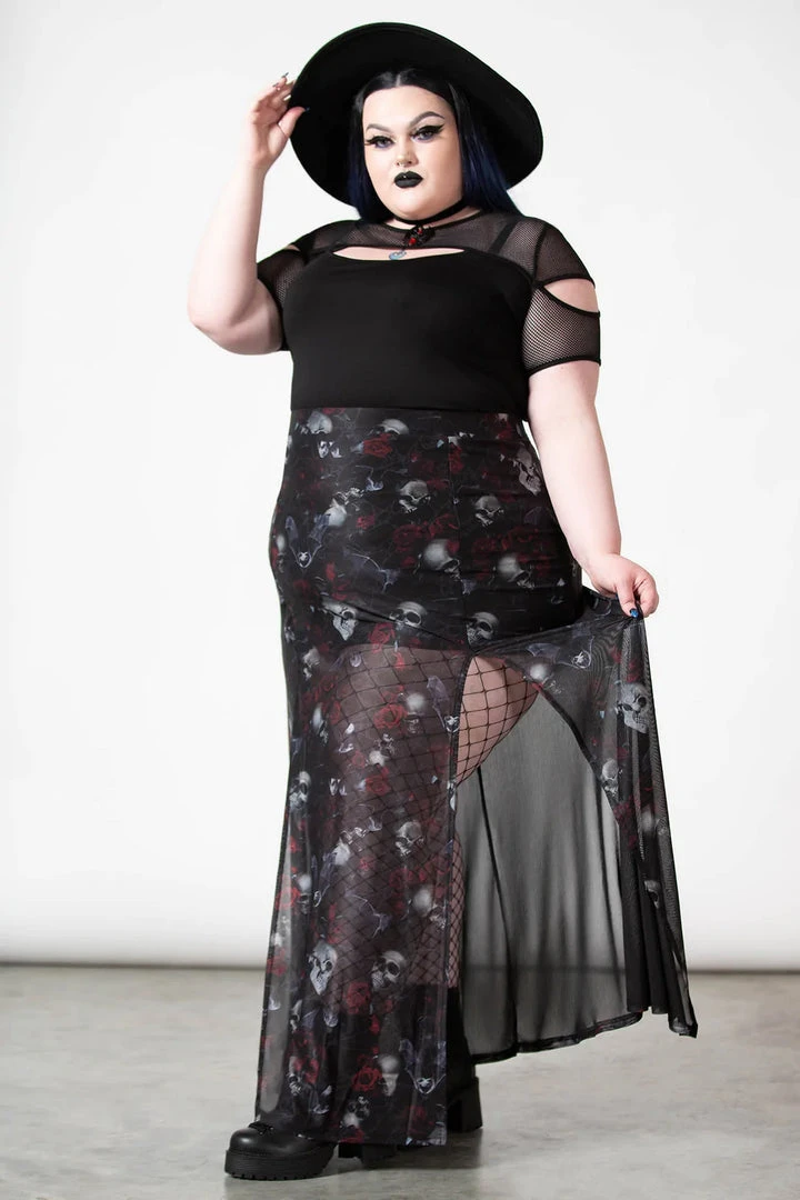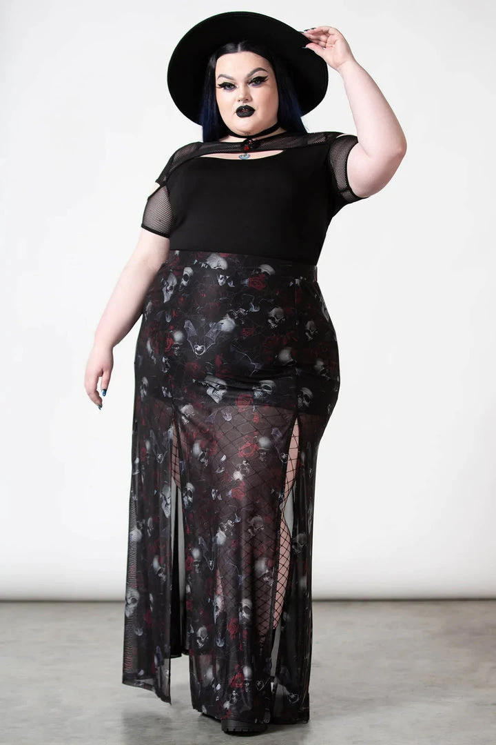 Lovely seductive black mesh maxi skirt from Killstar with statement skull and rose print! This gorgeous fitted black skirt is made from a luxury soft mesh fabric with double thigh splits and an opaque black mini skirt modesty lining! This beautiful fitted skirt also features an elasticated waistband for a smooth and comfortable fit! Looks gorgeous from day to night!