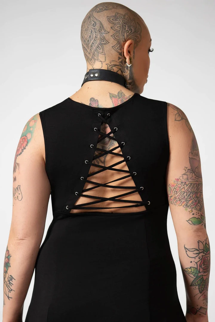 Showstopping black dress from Killstar! This stunning mini dress is made from a luxury soft stretchy fabric that is fitted to accentuate your figure with a hanky hem and stunning lace up back. This amazing black party dress features shoulder straps with metal hardware details. Beautiful and glamorous, this dress has a nipped in waist and flowing a line skirt.