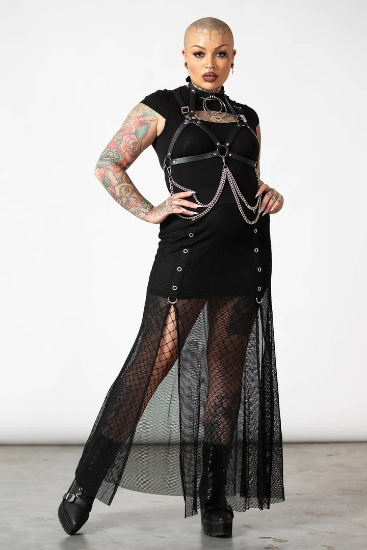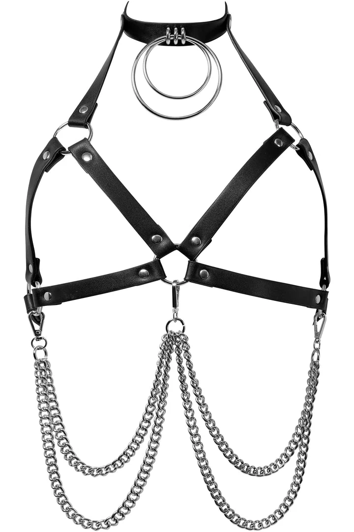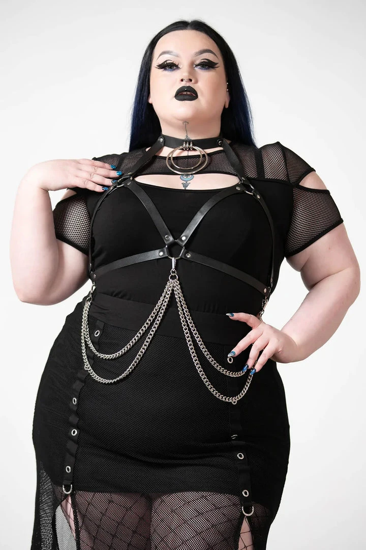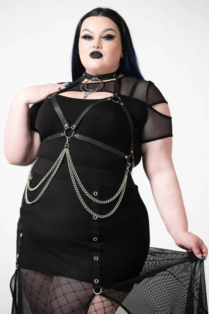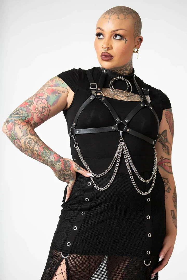 Push them to the edge and complete your look with this statement chain harness from Killstar! Featuring a soft faux-leather body with double O ring choker, chest strap, metal hardware and detachable chains. Adjustable size. Add onto any outfit to create instant drama!