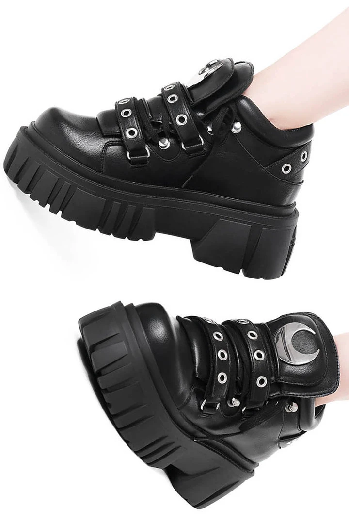 Killstar Livia Black Platform Trainers are made from vegan leather and will elevate your look with a 6.5cm/2.5″ rubber sole! These practical and stylish trainers feature crescent moon hardware and a lace up front with strap overlay.