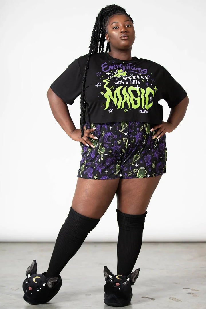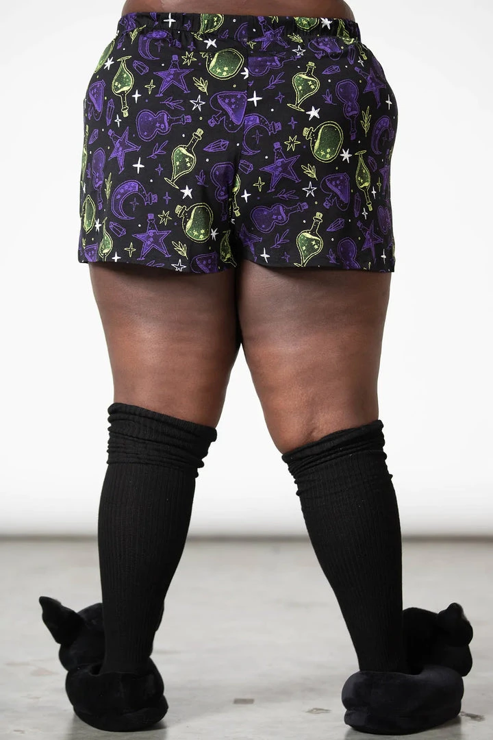 Playful and comfy black pj shorts from Killstar with bold contrast potion, stars and moon pattern! These must-have lounge shorts are made from a soft stretchy fabric with elasticated waistband for a comfortable yet flattering silhouette! The perfect thing for lounging in style, get the Killstar Magic tops for the complete outfit! Ideal as an alternative to average pyjama sets!