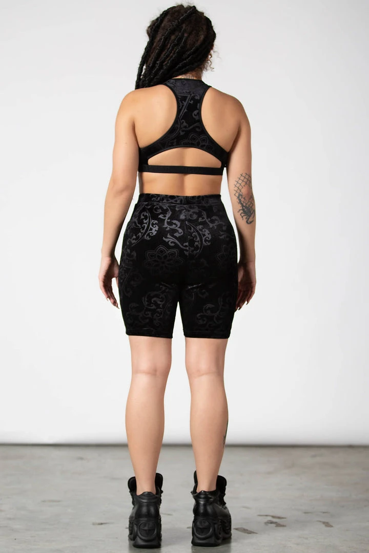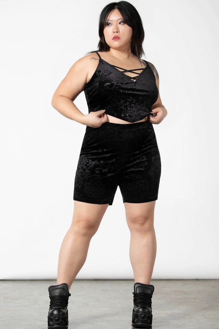 Must-have black cycle shorts by Killstar that are made from a luxurious stretchy burnout velvet fabric that will show off those curves. These gorgeous shorts feature a wide high waistband and will match the Mortalia bralet perfectly. Looks stunning as leisure wear or dressed up as you please!