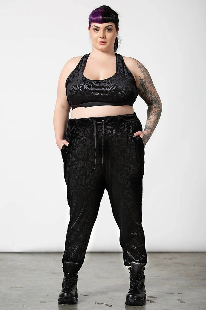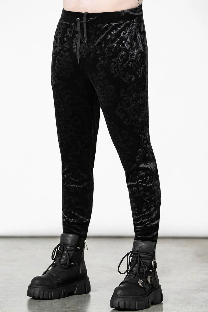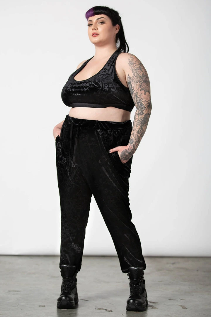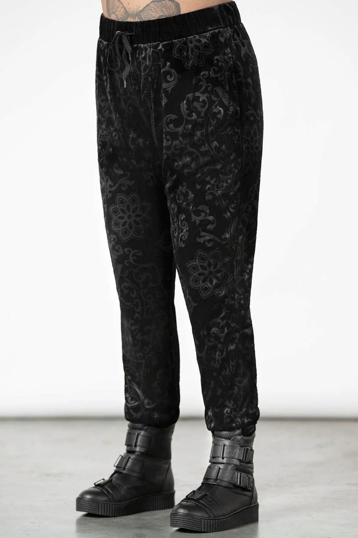 These stylish and practical black jogging bottoms are made from a luxury soft burnout velvet fabric in a long length slightly fitted style that looks good on everyone! These longline black unisex tracksuit bottoms feature stretchy fabric, cuffs, convenient pockets and a drawstring wide waistband.
